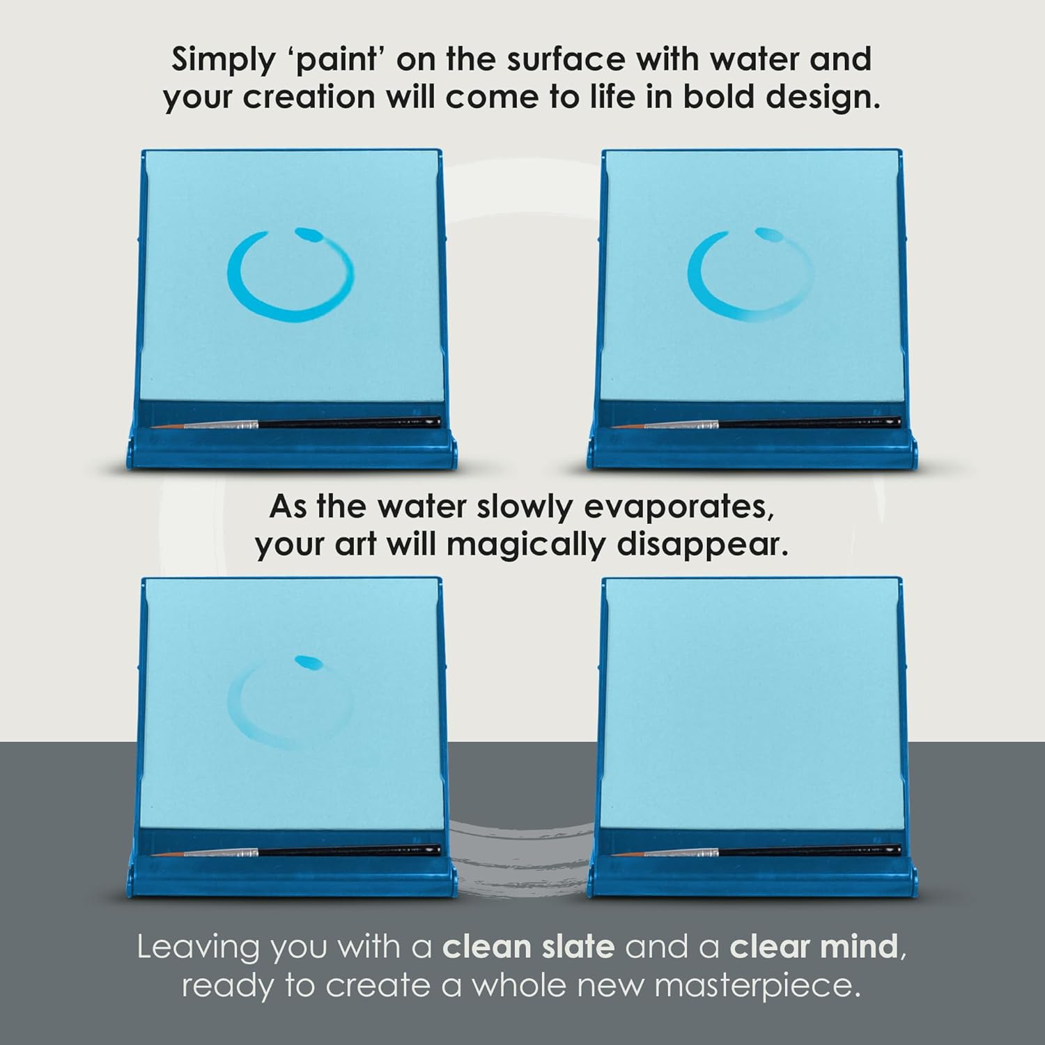 - EVERYTHING YOU NEED IS INCLUDED: This Zen-like water painting board for artists includes a travel-sized 5" x 5" water painting board that will return to its "blank slate" without flaws, bubbles, or peeling. A premium, mini brush with thick, ultra-soft bristles is included with our Zen painting board. Just add water and artistic expression. We also have included a 1 Year of Quality Promise.