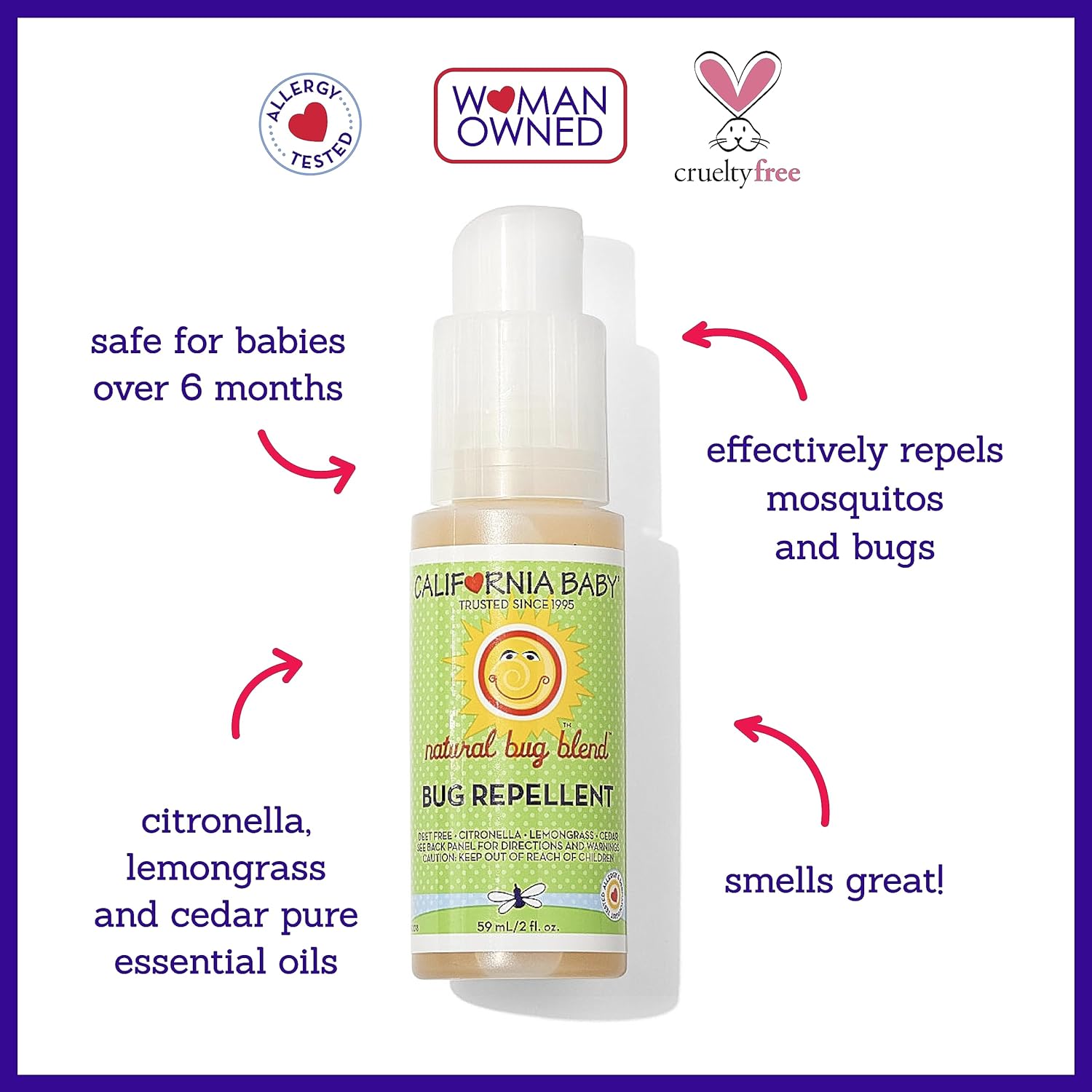 California Baby Natural Bug Repellent Spray | Citronella Bug Spray | DEET-Free | Repels Mosquitoes + Bugs | Allergy Friendly | Great Smell | Baby & Adult Insect Repellent Spray | 59 mL / 2 oz.