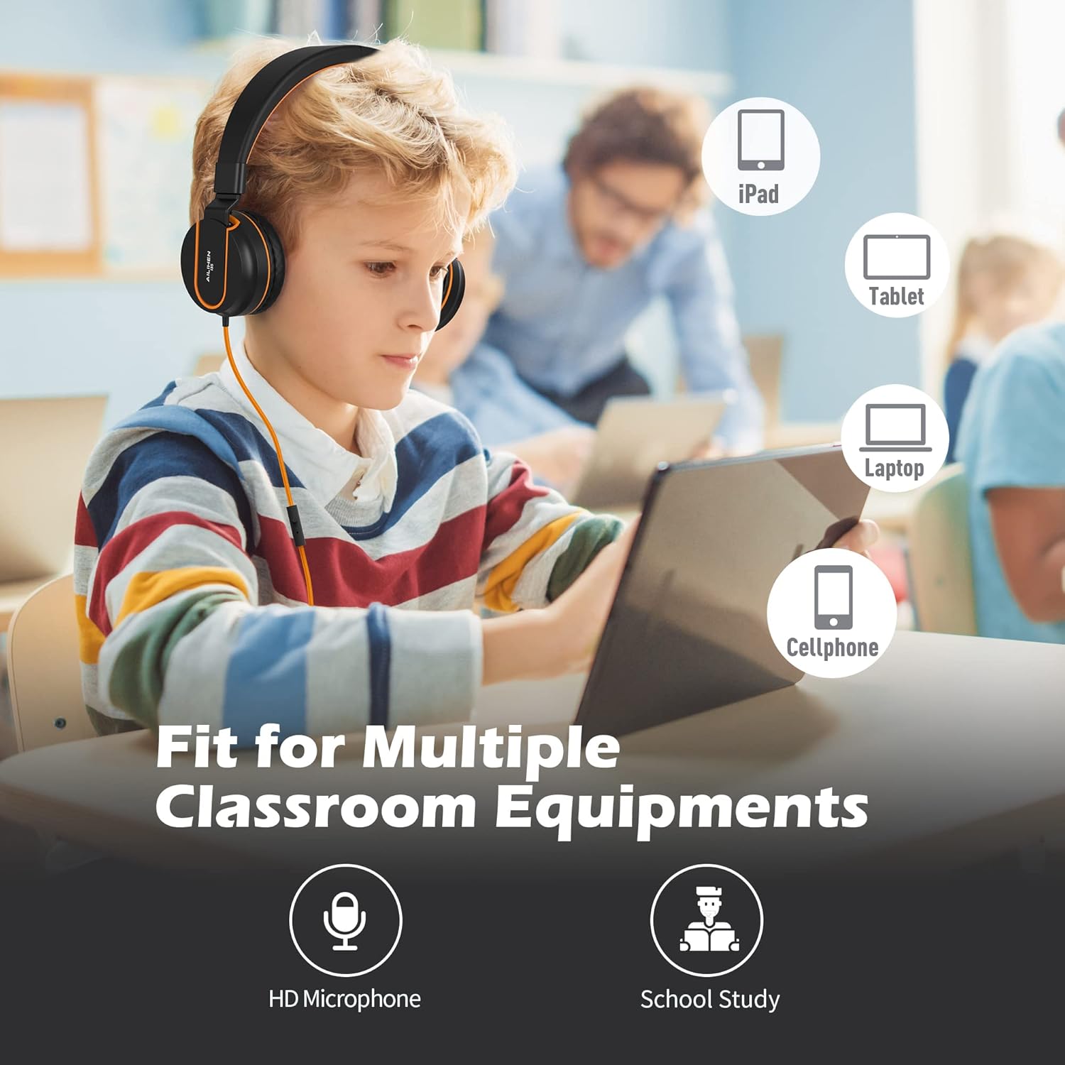 AILIHEN Kids Headphones, I35 On-Ear Headphones for School, Safe Volume 93dB, HD Mic Stereo Headphone for Kid Girls Boys, Foldable 3.5mm Wired for Chromebook, Laptop, Computer, Tablet (Black Orange)