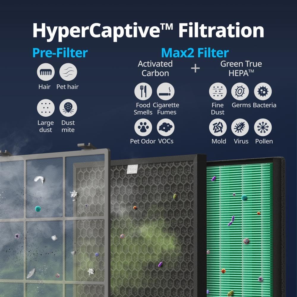 - [HyperCaptive Filtration System] Combination of a pre-filter, deodorization filter, and True HEPA Filter reduces 99.999% of 0.01-micron particles, including pollen and other allergens. It also reduces 99% of volatile organic compounds and odor