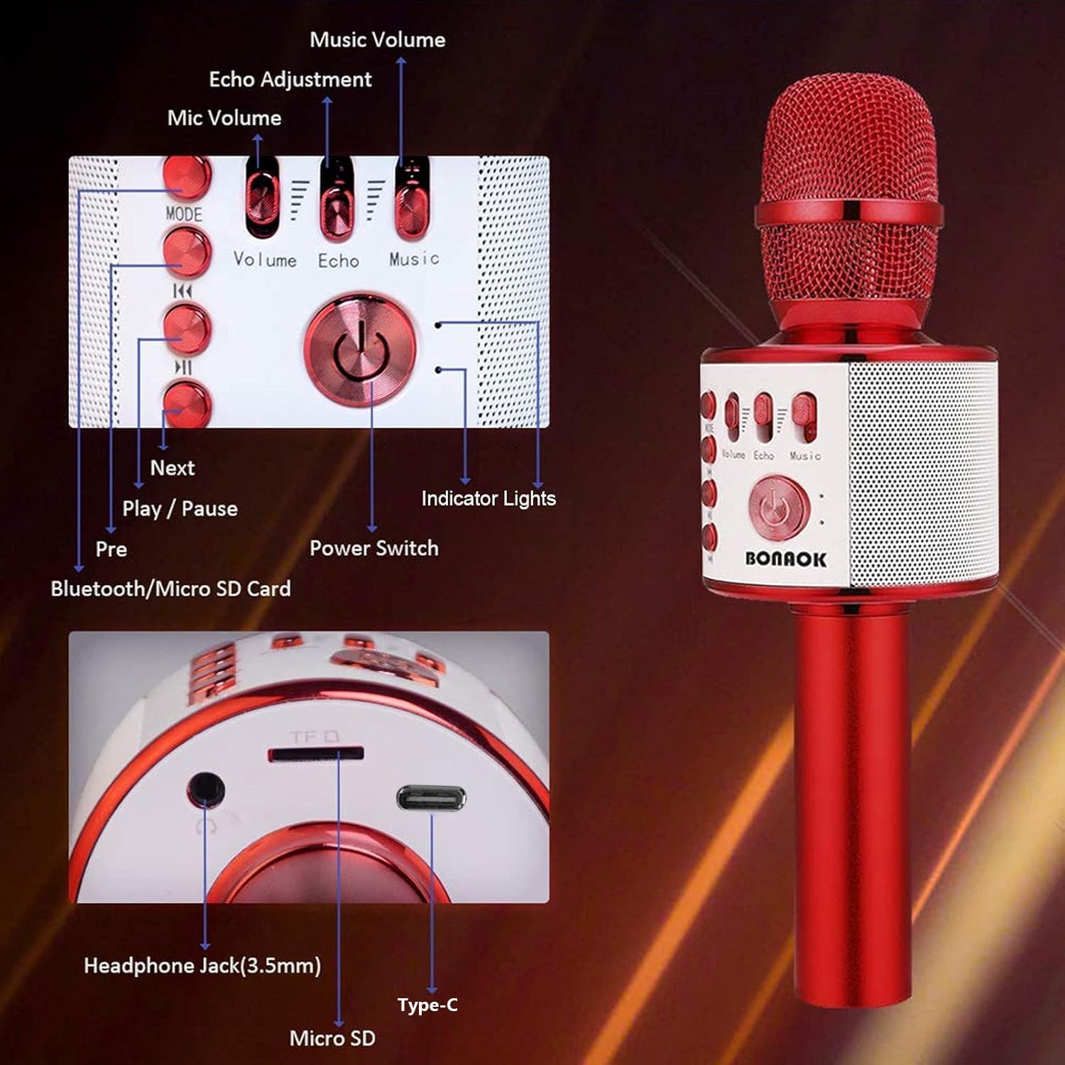 - MICROPHONE FOR KIDS & ADULTS: Come with 1* BONAOK microphone, 1* Audio Cable, 1*Charge Cable, 1*User Manual, and 1*Colorful Box. Cute gifts idea for kids, teens and adults, friends and family, suitable for all kinds of holidays and festivals