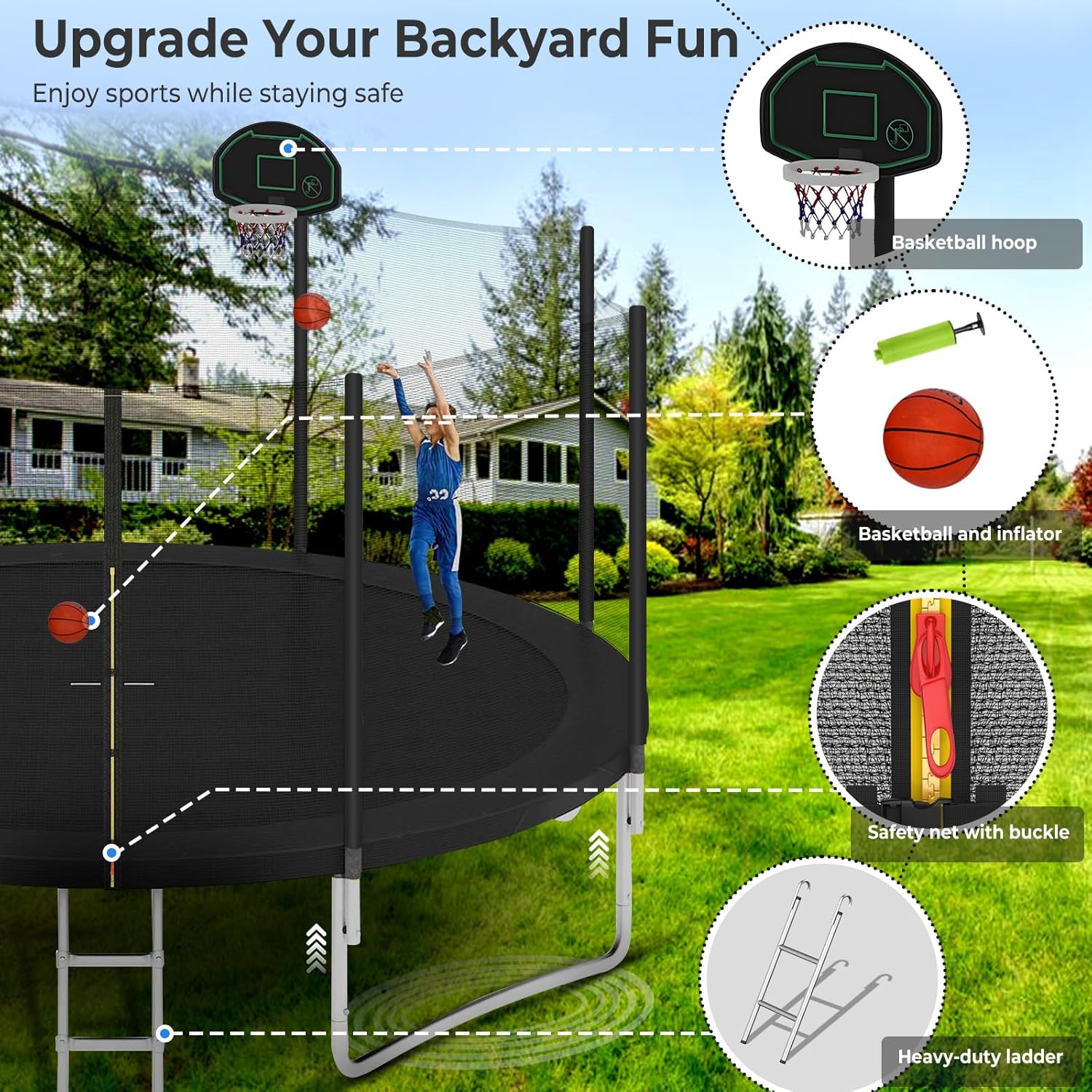Upgraded 10/12/14/15/16FT Trampoline Outdoor, Large Kids Trampoline with Light, Stakes, Sprinkler, Backyard Trampoline with Basketball Hoop and Net, Capacity for 4-6 Kids and Adults