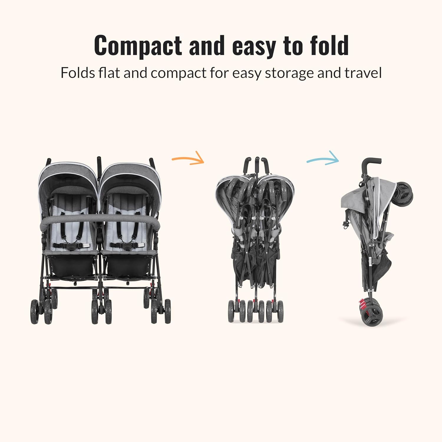 Dream On Me Volgo Twin Umbrella Stroller in Gray, Lightweight Double Stroller for Infant & Toddler, Compact Easy Fold, Large Storage Basket, Large and Adjustable Canopy