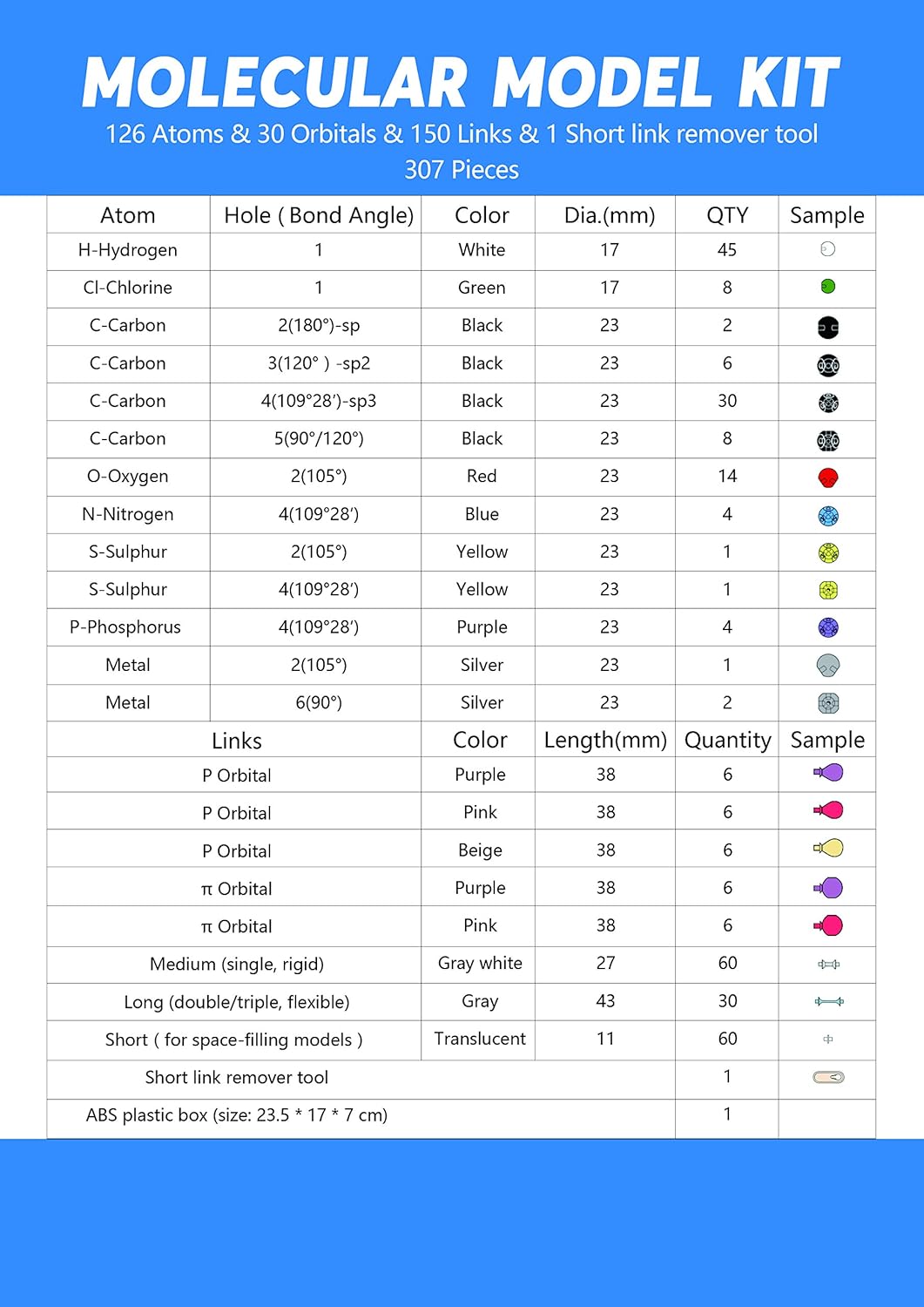 - ★ MOLECULE SCIENCE IN 3D --- We have prepared 307 Pcs molecular model set for you, Includes study guide instruction manual. Sets have pieces of atom centers, bonds, and orbitals for assembly and tool for removing bonds inorganic molecules, empirical formula representations, organic structures, and other concepts of inorganic and organic chemistry