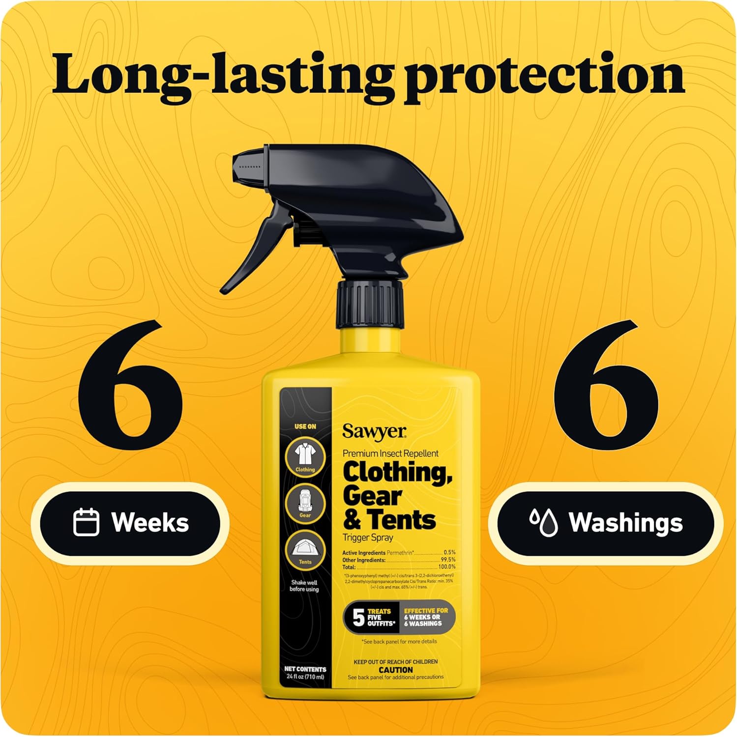 - Sawyer Permethrin stays effective despite sweat or water, degrades via UV exposure or washing machine agitation; each 24-ounce trigger spray bottle treats 5 outfits (EPA now reconmends 4.5 ounces per outfit consisting of shirt, pants, and socks)