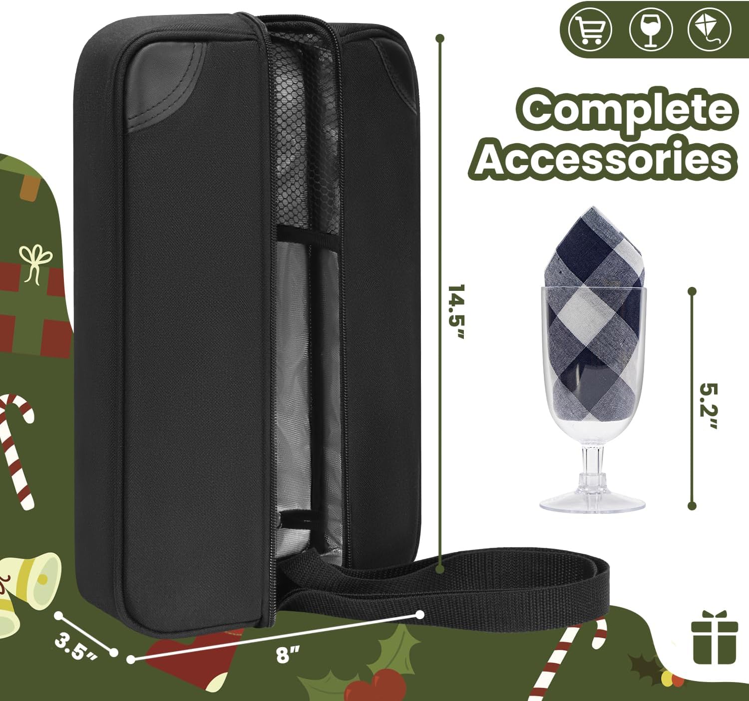 - Complete Wine Picnic Set for Two:This elegant black wine tote bag includes everything you need for a perfect outing: 2 plastic wine glasses, 1 stainless steel corkscrew, 1 bottle stopper, and 2 napkins. Everything is neatly organized and ready for your next adventure.