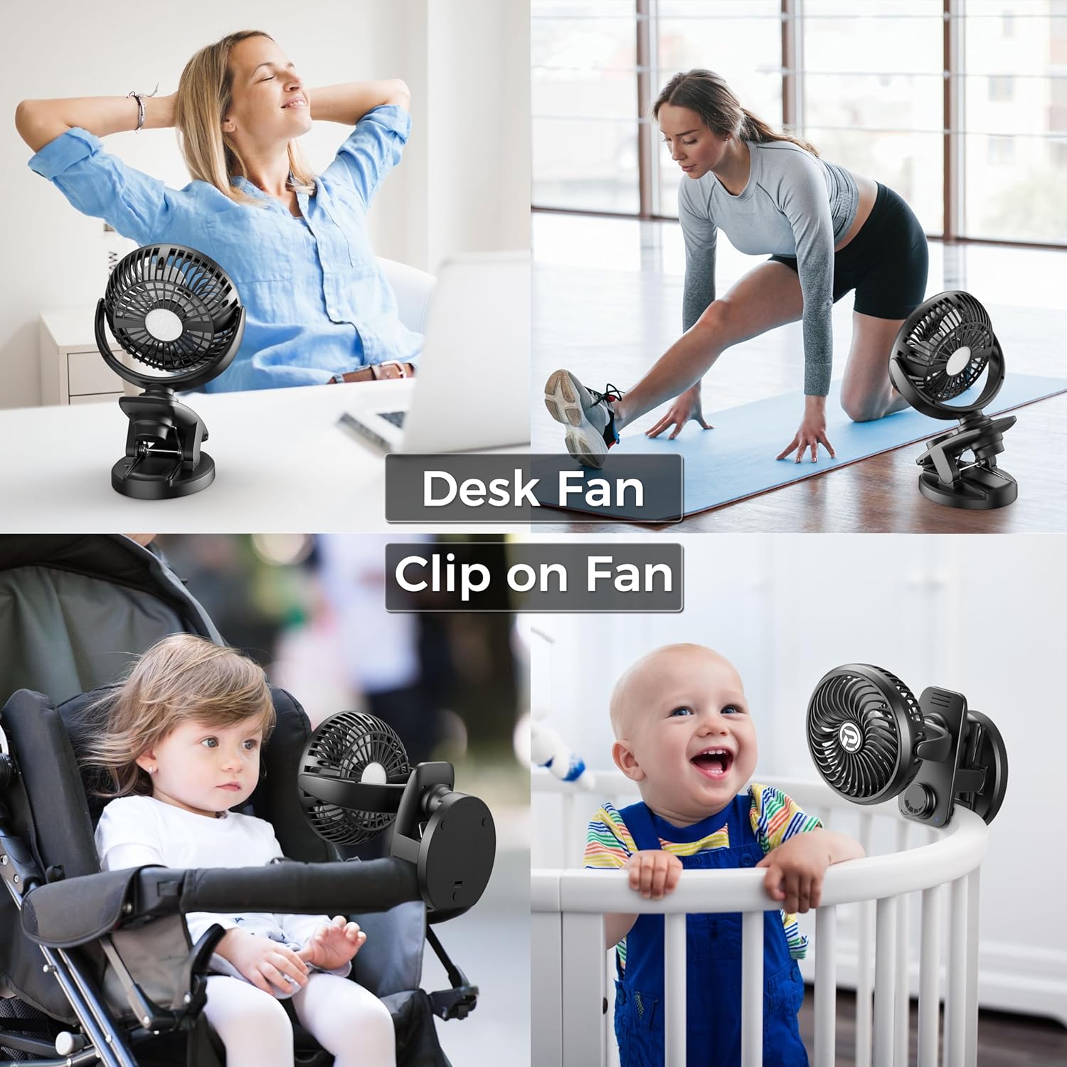 - USE IT ANYWHERE ANYTIME: Clip/Stand 2 in 1 design, light weight and portable size(5.7x3.7x9.1 inch) make it perfect for baby stroller, hurricane, home, office, gym, camping, traveling, etc