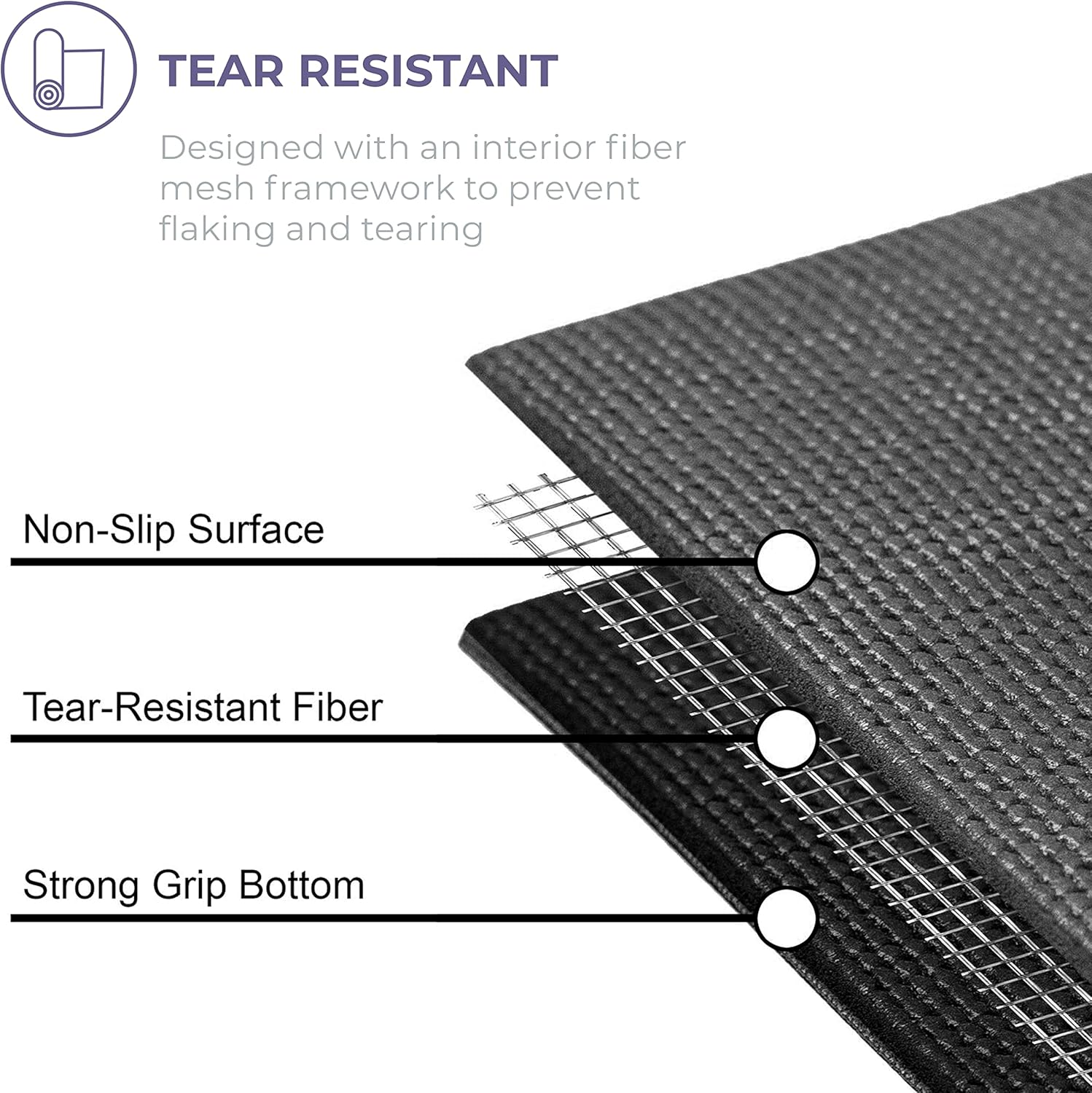 - Non-Slip: The fitness mat features a textured surface for stability and balance when changing or maintaining poses; created with an interior fiber mesh layer to reduce mat stretch and resist tears for longevity