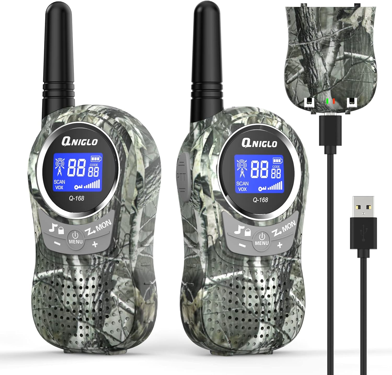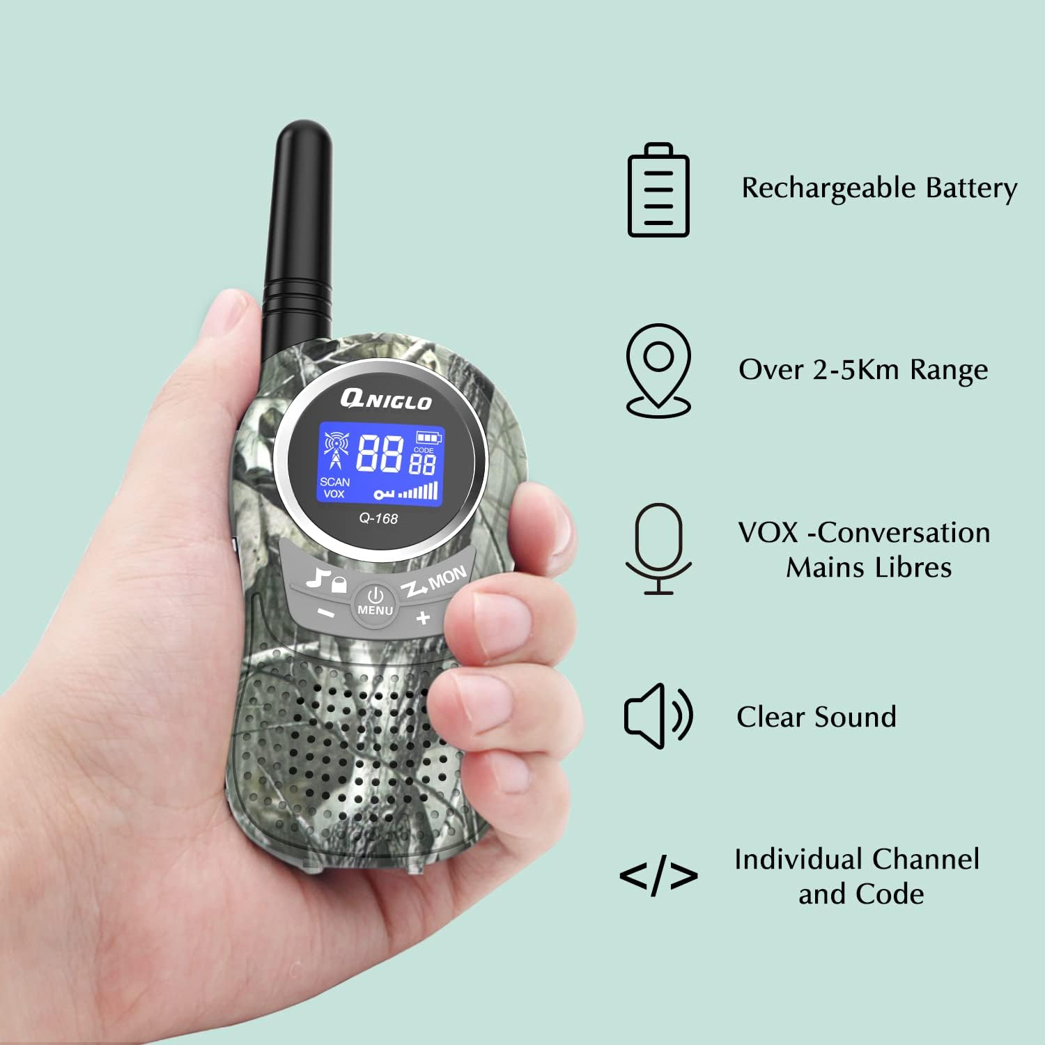 - Perfect Gifts for Kids - Qniglo's rechargeable walkie talkies come stylish packaged, making them ideal for kids, friends, or family members as Christmas, birthdays, or any special occasion gifts. The toys walkie talkies gifts are perfect for 3-8 year old boys and girls, serving as both toys for indoor and outdoor activities like hide and seek, adventure games, cruise games, camping, pretend play.