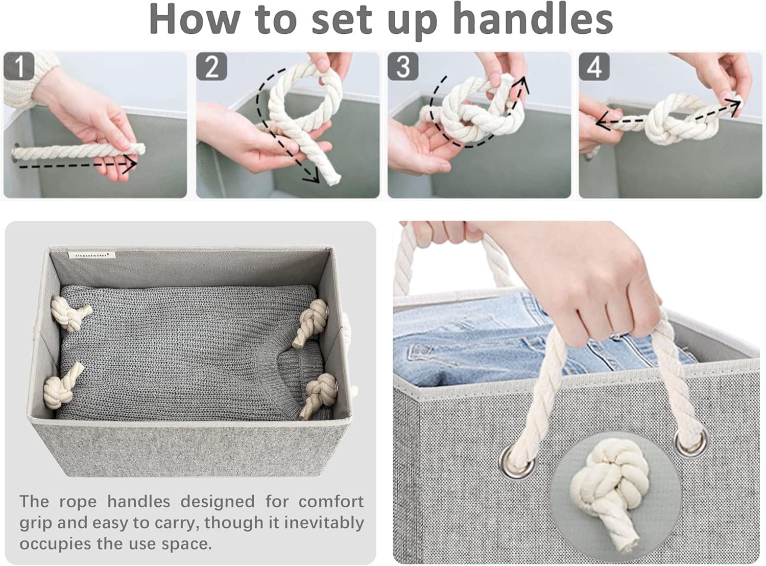 StorageWorks Large Storage Bins with Lids, Decorative Storage Boxes with Lid and Soft Rope Handles, Foldable Storage Baskets for Closet, Shelves, Stackable, Gray, 3-Pack