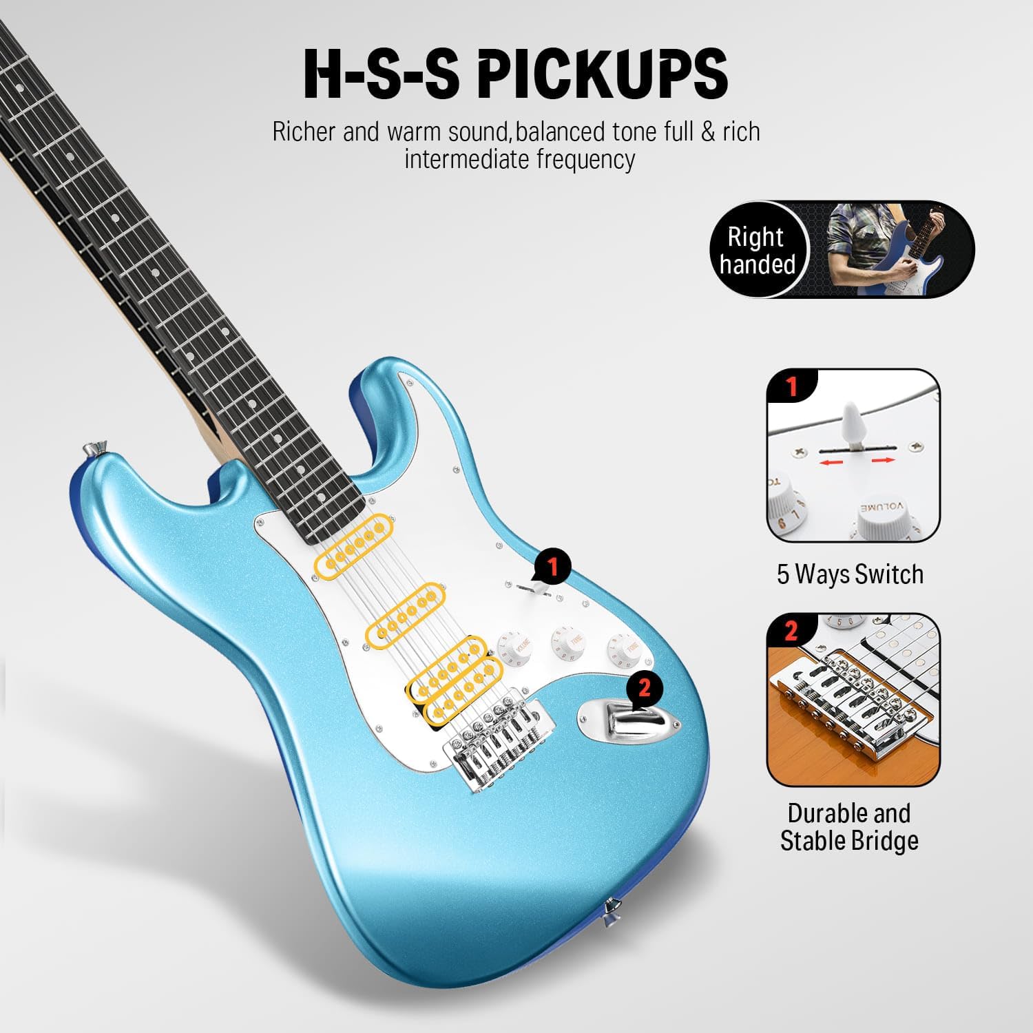 - [H-S-S pickups] Donner electric guitar has two classic Single-coil pickups and one power 203S Humbucker pickup. 5 ways pickup switches and 2-tone & Volume controls for choosing. Suitable for both beginners and professionals. H-S-S pickups are not just perfect for a Texas blues/rock sound, but for other musical styles too