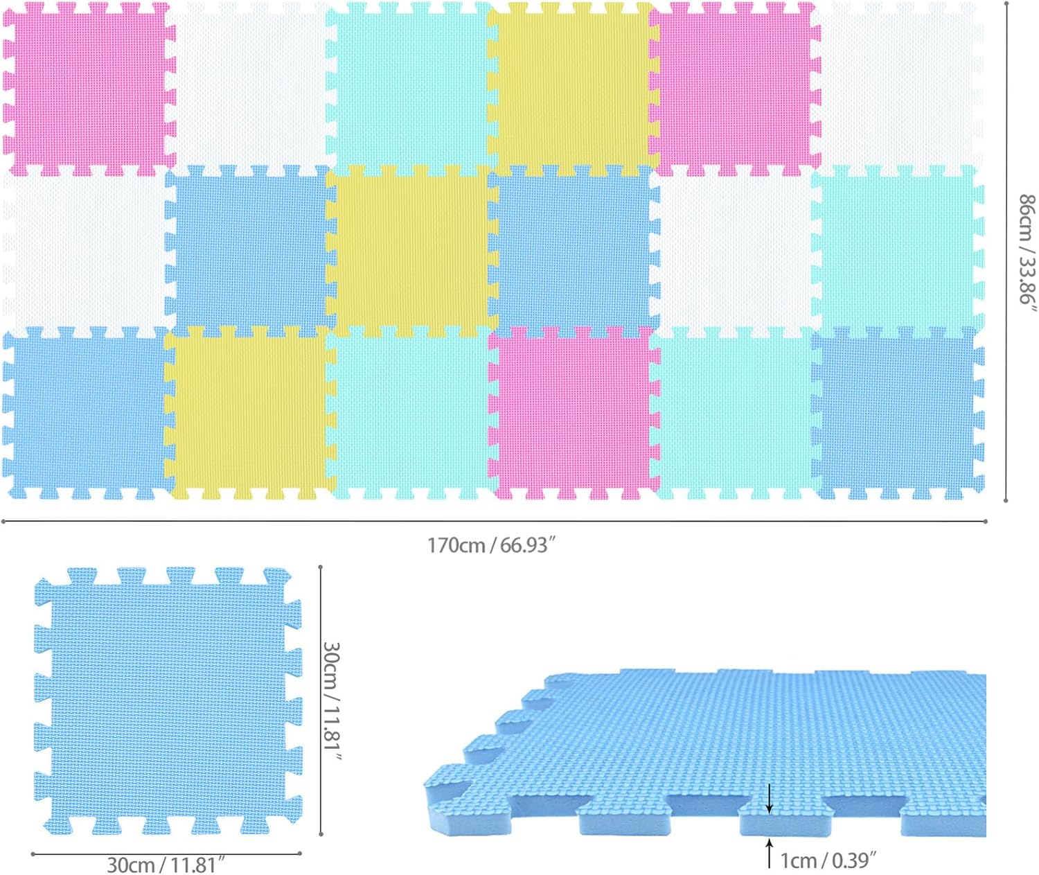 - FOAM FLOOR MAT SIZE - 18 Interlocking square mats of 11.8"*11.8", the thickness is 0.39", covering an area of 16 sq.ft after assembly.