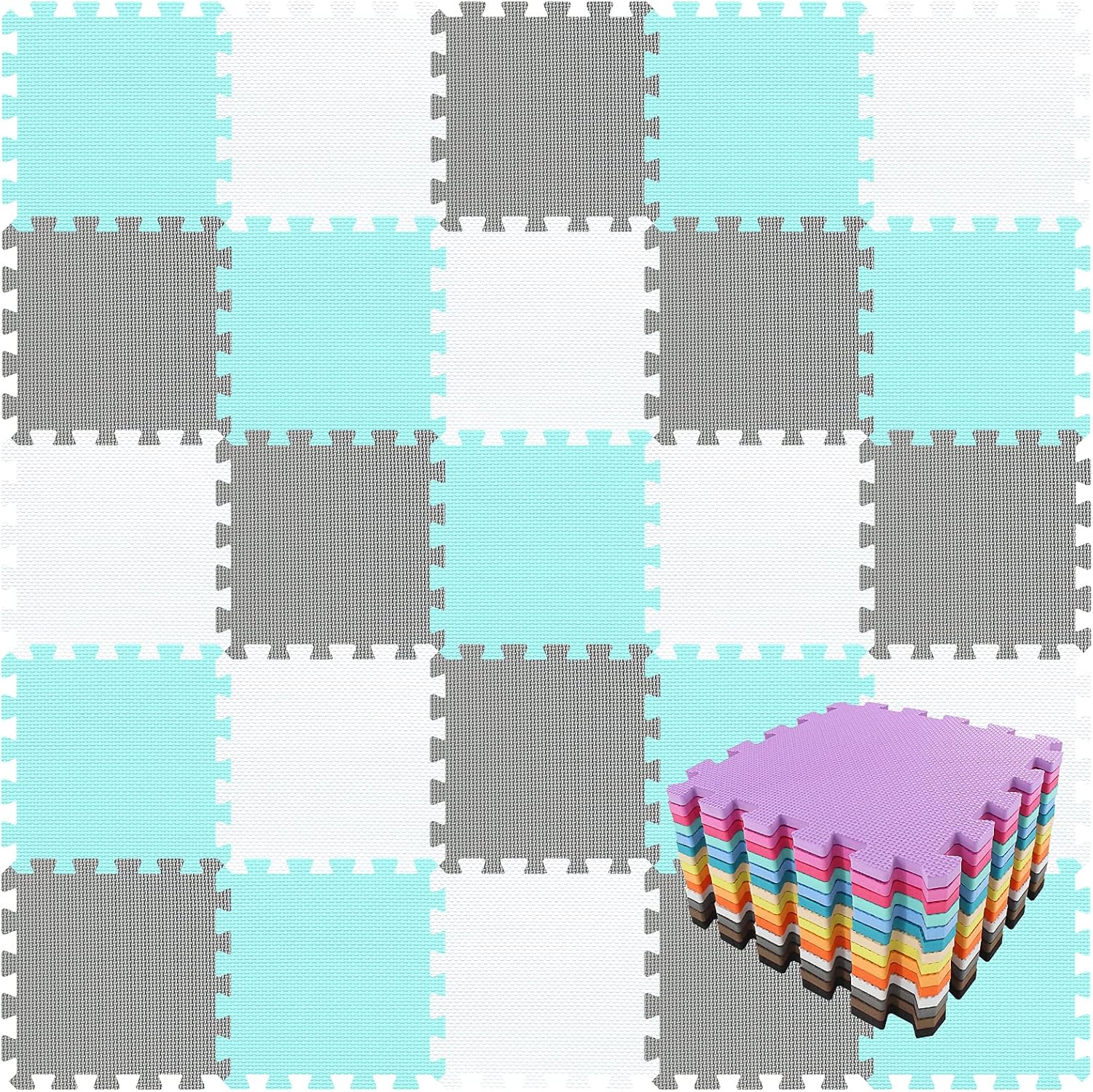qqpp EVA Rubber 18 Tiles Interlocking Puzzle Foam Floor Mats - Baby Play Mat for Playing | Exercise Mat for Home Workout. White, Green, Gray. QC-AHLb18N