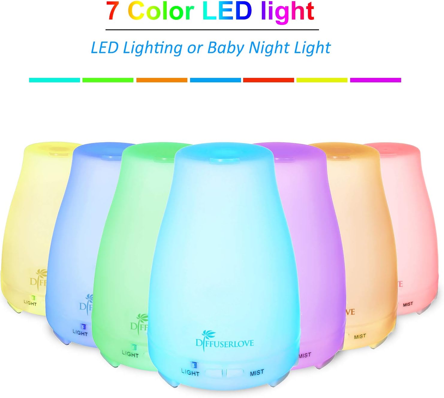 - 【7 Color LED Light】Aroma Diffuser Spark Your Kid's Imagination with 7 Changing Mood Lights, each of which is adjustable between Bright and Dim modes, and could be set steady on. Great night light for young children scared of the dark at bedtime. Color including: Green, Dark blue, Red, Yellow, Pink, Light blue, White.