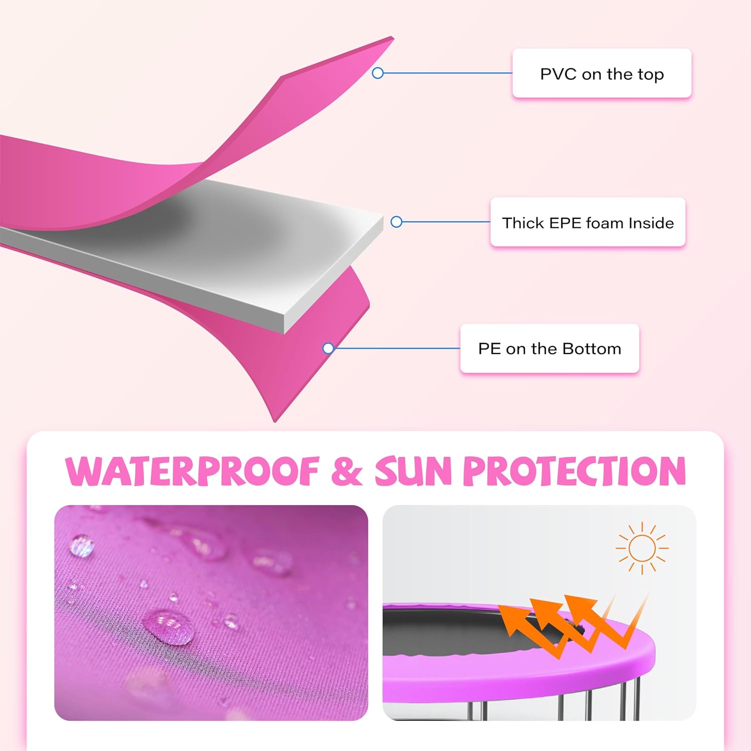 - Specification: Trampoline pad width: 8/10FT: 9.45 inch (24cm), 12FT: 8.66 inch (22cm), 14/15FT: 10.63inch (27cm). Anti-UV/Waterproof/Faded Resistance PVC cover,thick EPE foam(16mm), PE bottom, ultra durable for years to use!
