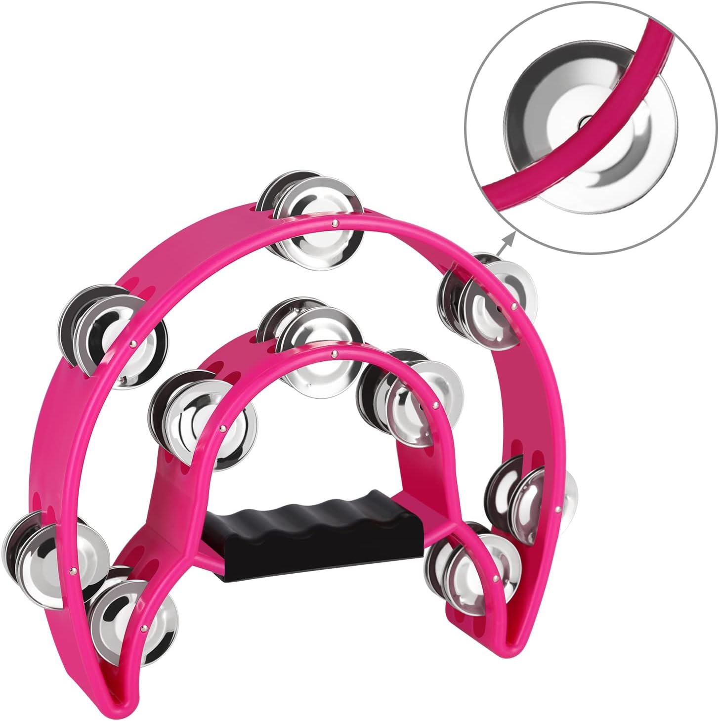 - Unique Design- This tambourine adopts a semi-circular arc appearance and a concave-convex handle design, which is non-slip and wear-resistant, stable and firm, the tambourine is not easy to slip by hands. The edge of the bell is curled, which does not hurt your hands, you can use this tambourine with confidence