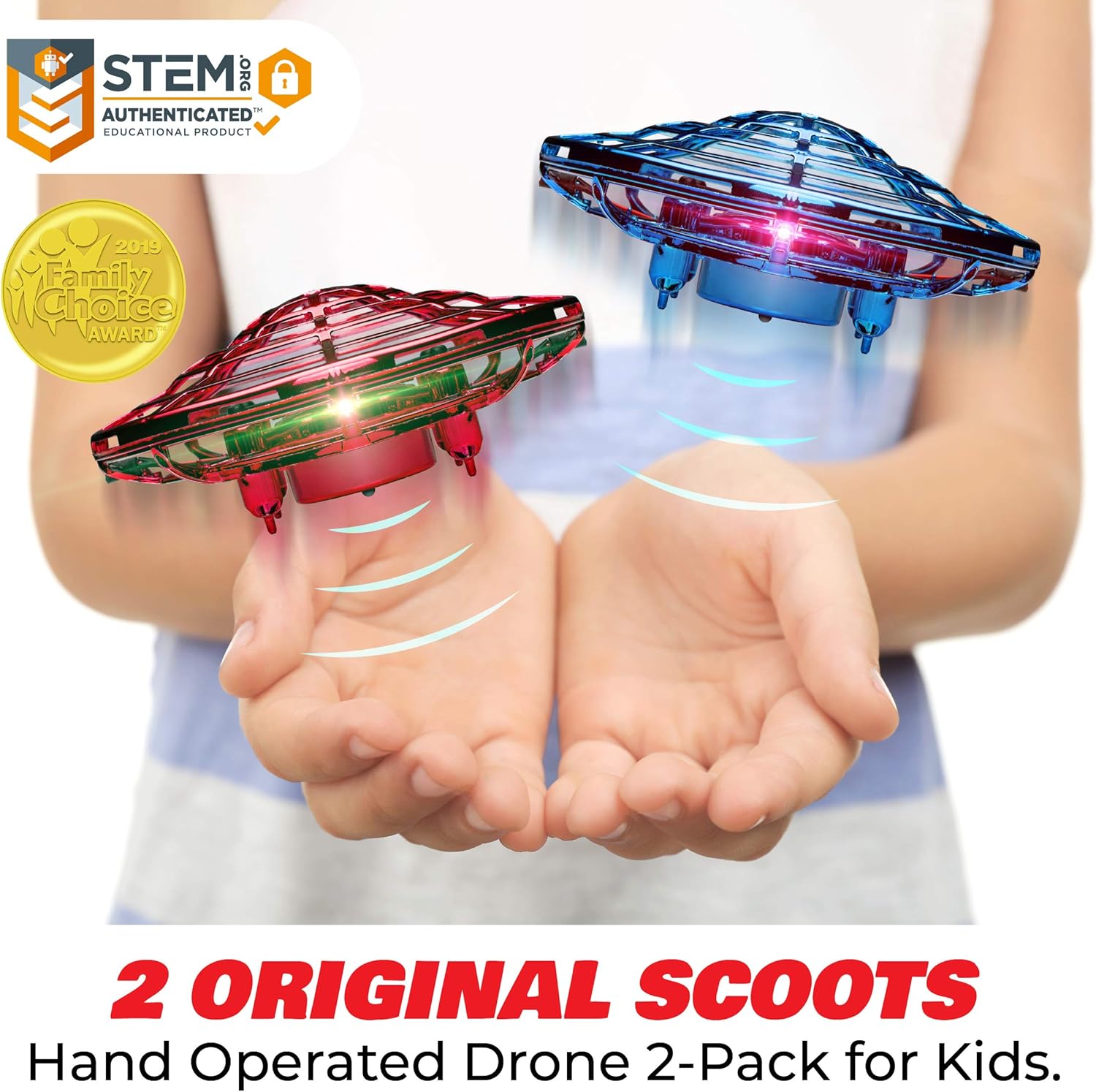 - 2 Pack Original Scoot Drones for Kids: The first and the most-loved hand operated drone in Force1’s Scoot drone family now comes in a pack of 2! Toss to launch this hand drone into the air and enjoy vibrant LEDs light up this UFO flying toy with every flight; this UFO drone pack includes 1 red and 1 blue hand operated drones for kids