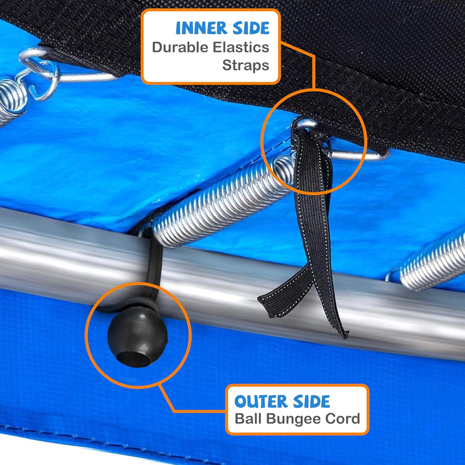 - Specification: Trampoline pad width: 8/10FT: 9.45 inch (24cm), 12FT: 8.66 inch (22cm), 14/15FT: 10.63inch (27cm). Anti-UV/Waterproof/Faded Resistance PVC cover,thick EPE foam(16mm), PE bottom, ultra durable for years to use!