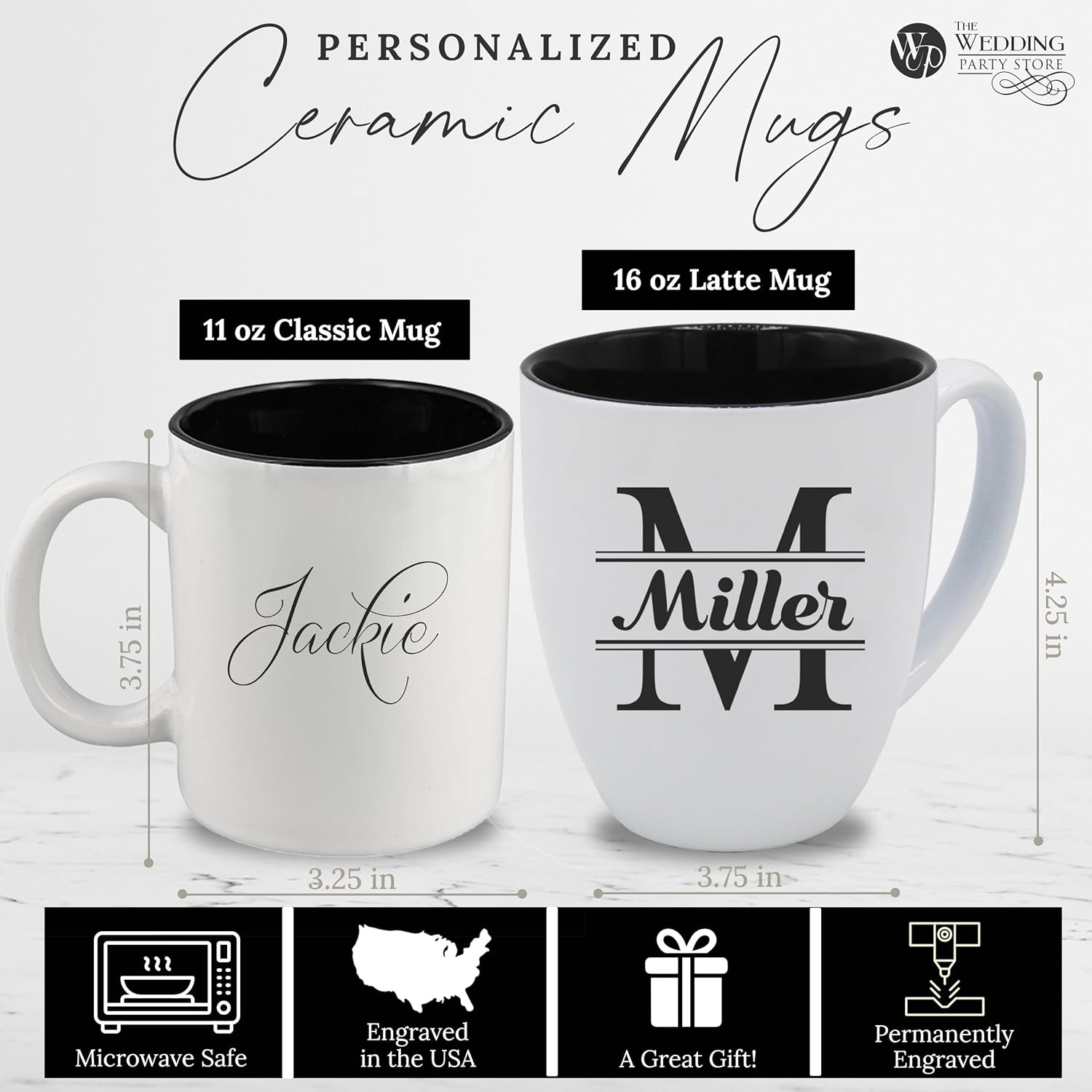- Size - Two different size mugs. Classic mug holds 11 oz and the premium latte mug holds 16 oz of your favorite coffee, tea or hot chocolate!
