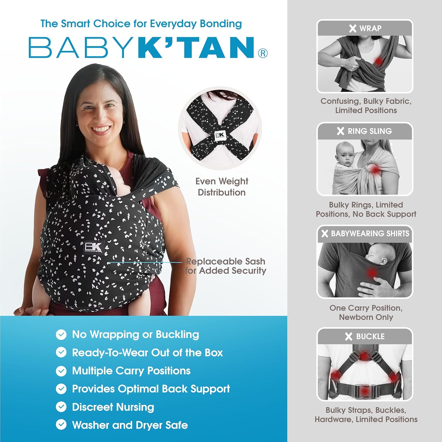 - [A WRAP WITHOUT the WRAPPING] The Baby K'tan Baby Carrier is quick and easy to wear. No complicated straps or buckles! This carrier is a SIMPLE, wrap-style carrier that is pre-wrapped and sized for the parent, making it READY-TO-WEAR right out of the box. No learning curve. This carrier combines the benefits of a sling, wrap, and buckled carrier all into one, without any complicated wrapping or buckling! No rings, belts, buckles or excess fabric!