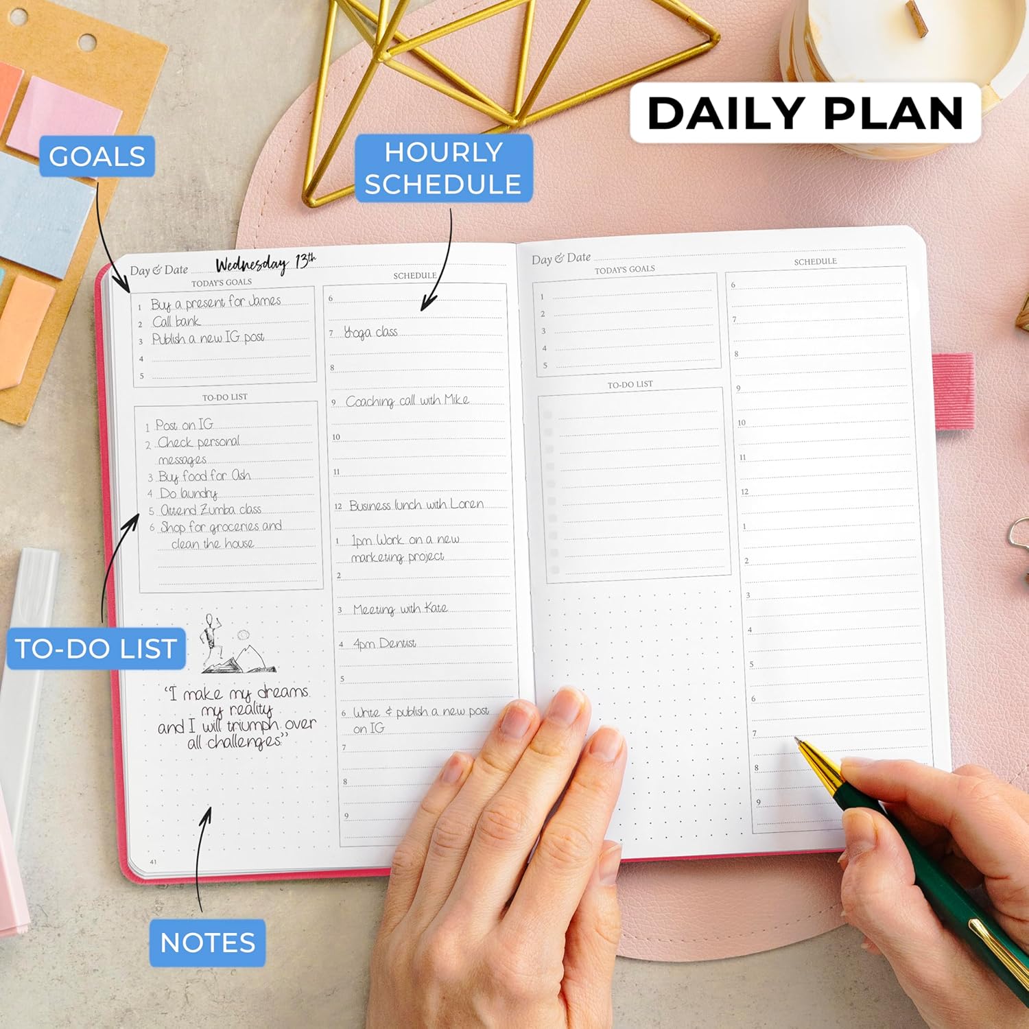 - NEW DAILY LAYOUT, LASTS 3 MONTHS - A separate page for each day of the week that has an hourly 6 to 9 schedule, today's goals, to-do list and dotted notes section. In total, there are 4 monthly calendars, 14 weekly and 98 daily pages, which is enough to set and achieve 3-5 quarterly goals. The planner is designed in this way to be compact, portable and perfect to use on the go.