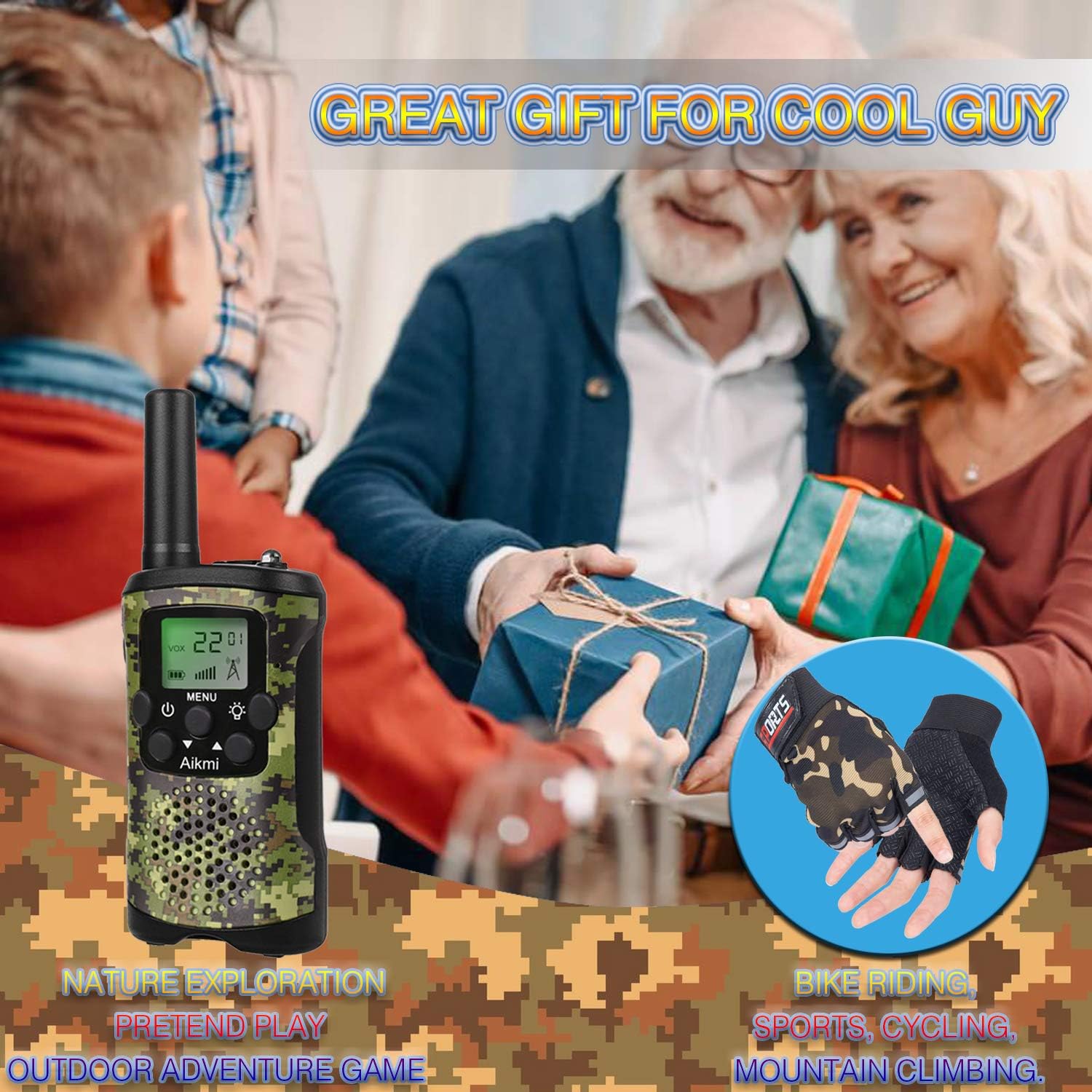 - OUTDOOR TOY FOR KIDS Less screen time, more outdoor activities. The army walkie talkies for kids come with half gloves for kids, suitable for camping, hiking, hunting, hide-and-seek, gun war, travel, party, cruises, nature exploration, outdoor adventure games and pretend play. Ideal holiday gifts for boys such as birthday, Halloween, Christmas