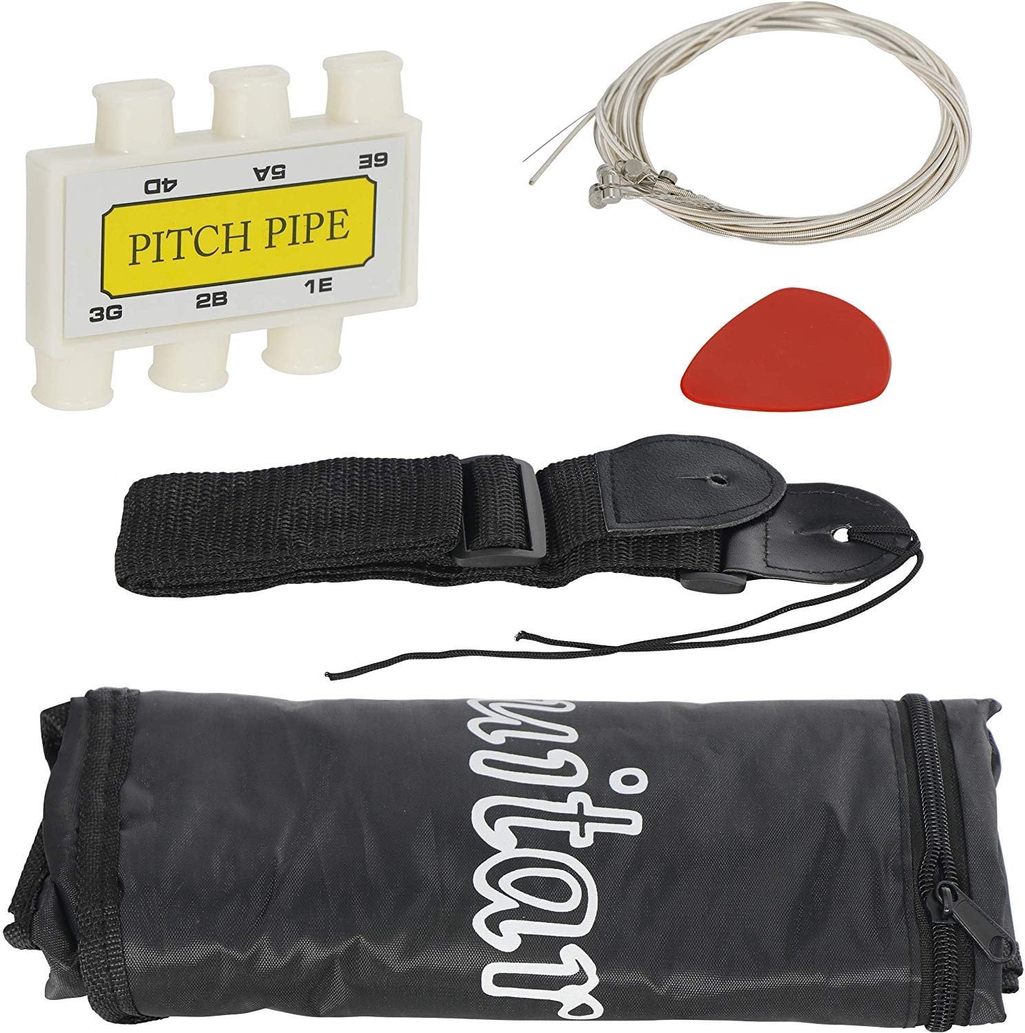- Complete 38 inch full size acoustic guitar which is sounds great with all wood construction, features 6-steel string. The slim neck provides a comfortable feel and excellent play ability, smooth finished surface maximizes resonance for optimal sound quality.