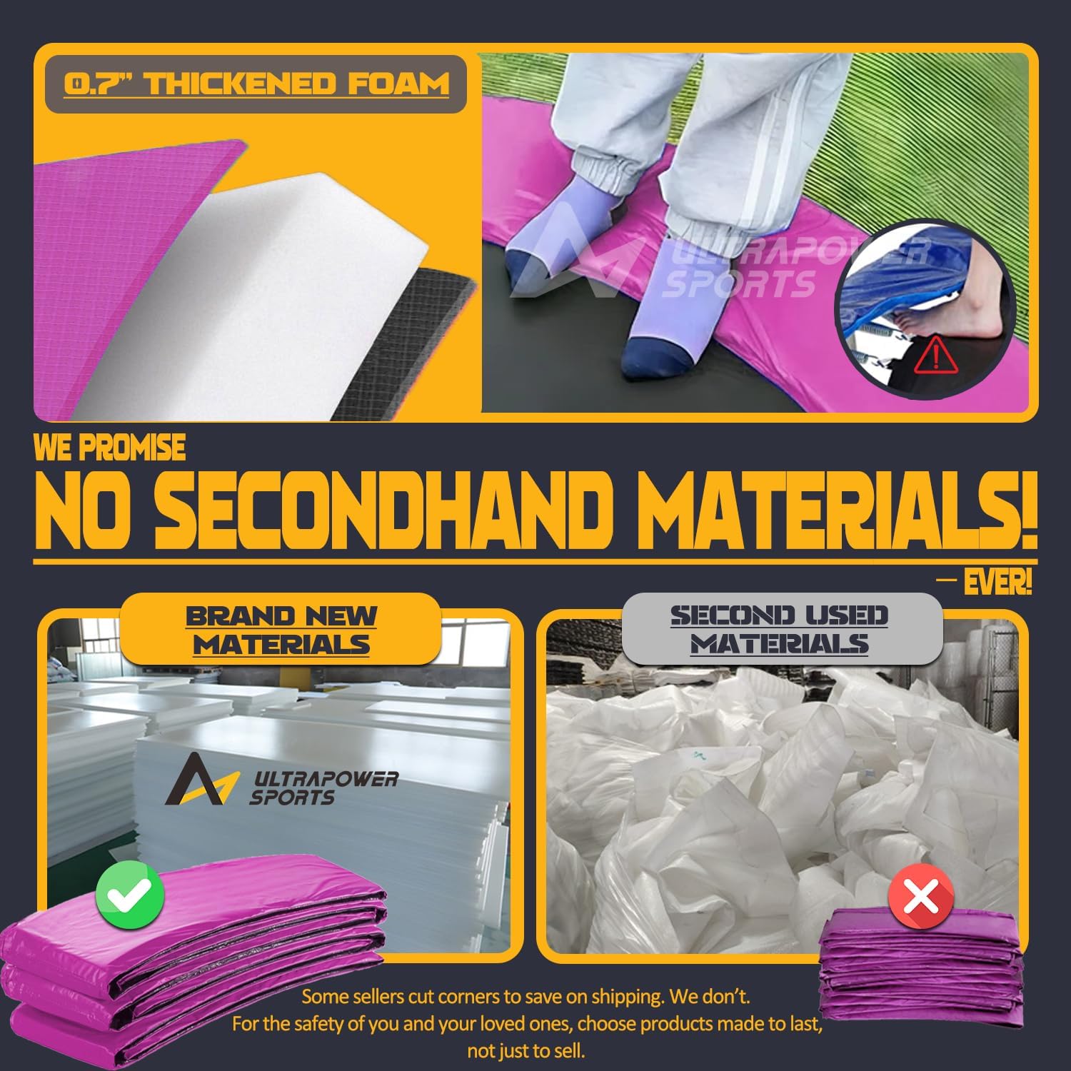 - 👨👩👧👧【270° All-Around Safety Protection】👨👩👧👧At ULTRAPOWER SPORTS, your child's safety comes first! Our trampoline pad replacement is designed to shield kids from exposed springs, preventing injuries while they jump. The extended 270° protective cover wraps around the trampoline frame, offering inside-out protection. Built for durability, it features a 0.55mm thick PVC surface + 0.6-inch protective cotton + an ultra-dense PE bottom, ensuring maximum safety, comfort and fun.
