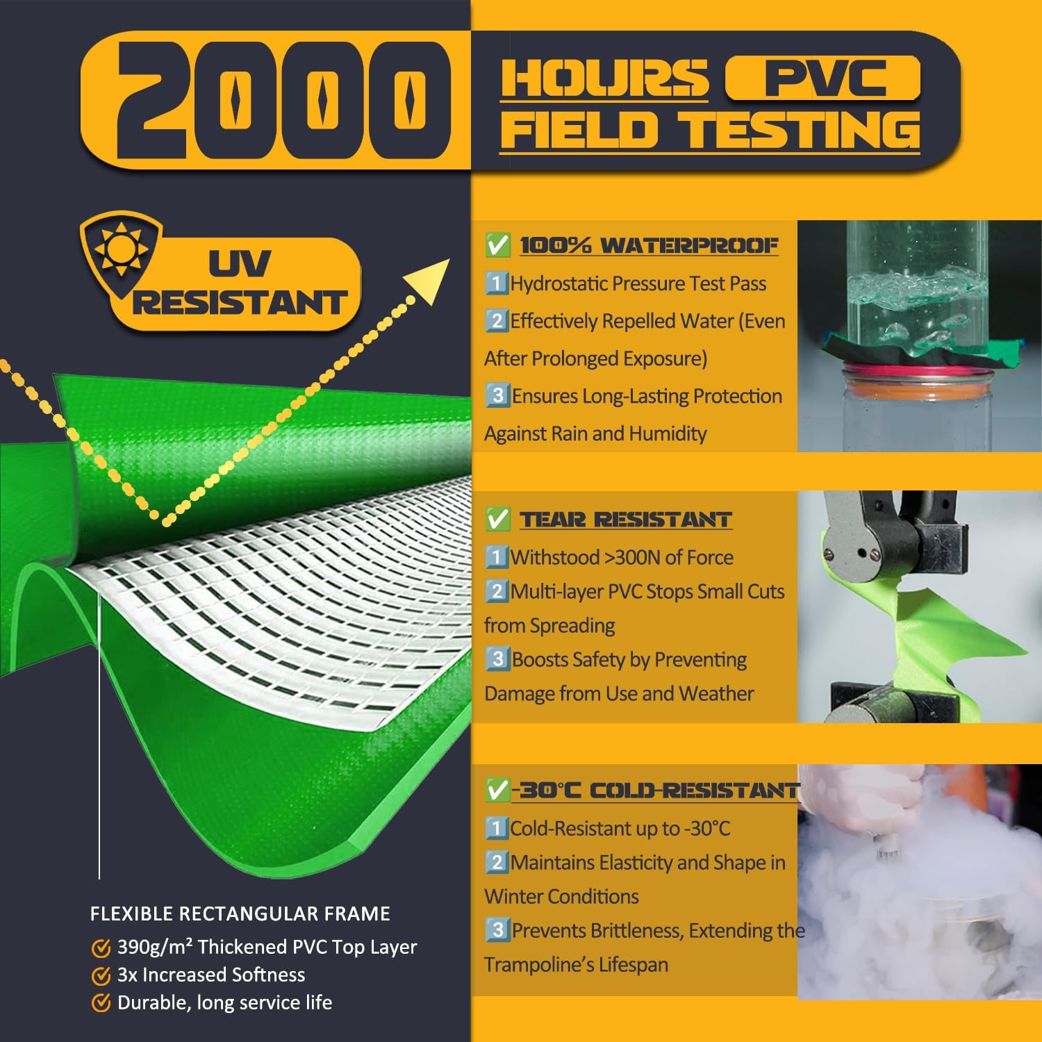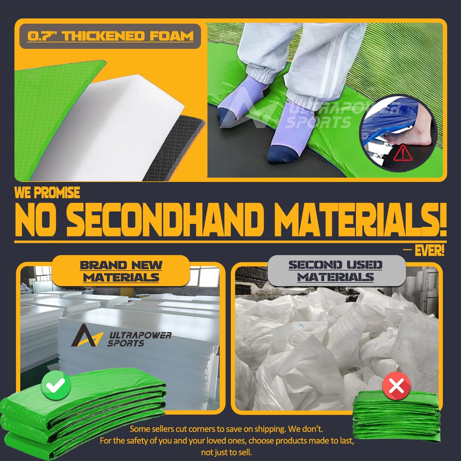 - 🏆️【Trusted Quality ULTRAPOWER SPORTS trampoline pad】 As a top-tier trampoline replacement mat brand, we prioritize safety and durability. We believe that you who appreciate quality will know how to choose wisely. The double industrial-grade stitching and triple-layer construction (PVC + PE + padding) outperform other flimsy covers. Whether replacing worn-out mats or upgrading old trampolines, choose our trampoline pad replacement that balances affordability with professional-grade performance.