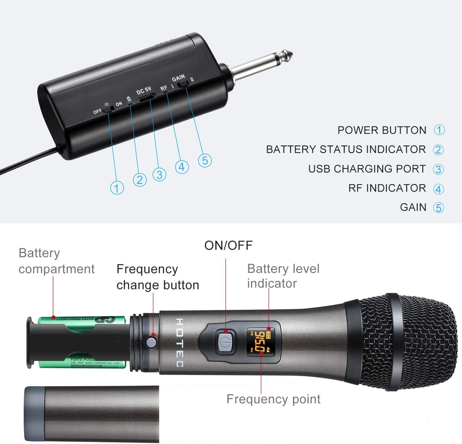 HOTEC UHF Wireless Dual Handheld Microphones with Rechargeable 1/4” Output Mini Portable Receiver for Live Performance Over PA, Mixer, Speaker (H-U26C)