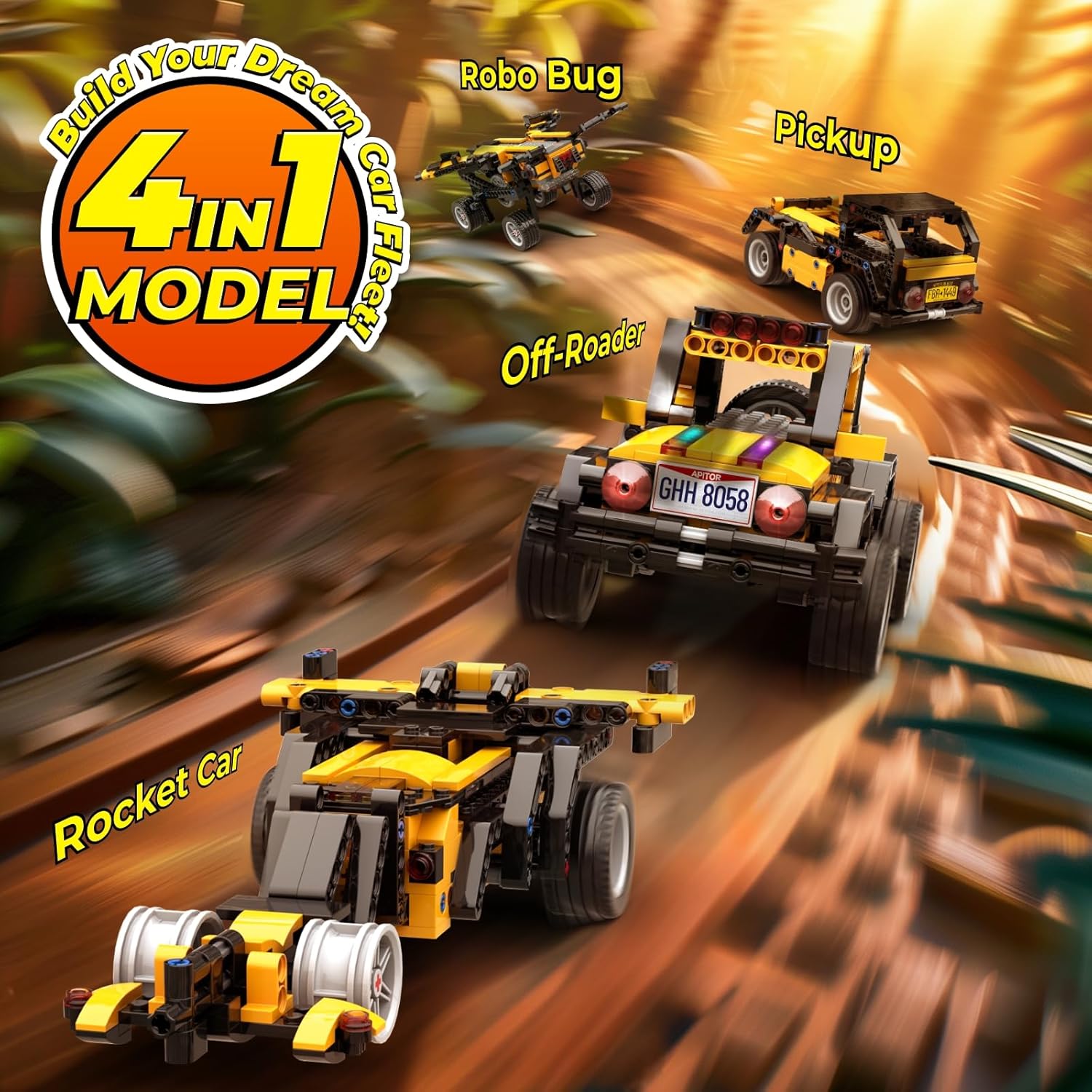- 4-in-1 Robot Car Kit: 2024 NEW remote control off roader includes 300 blocks and car stickers, 1 control module (with 2 high-speed motors), 2 LED lights, 1 building instruction, 1 sorting tray. Kids can build 4 different realistic models. Create your own stem robots and projects.