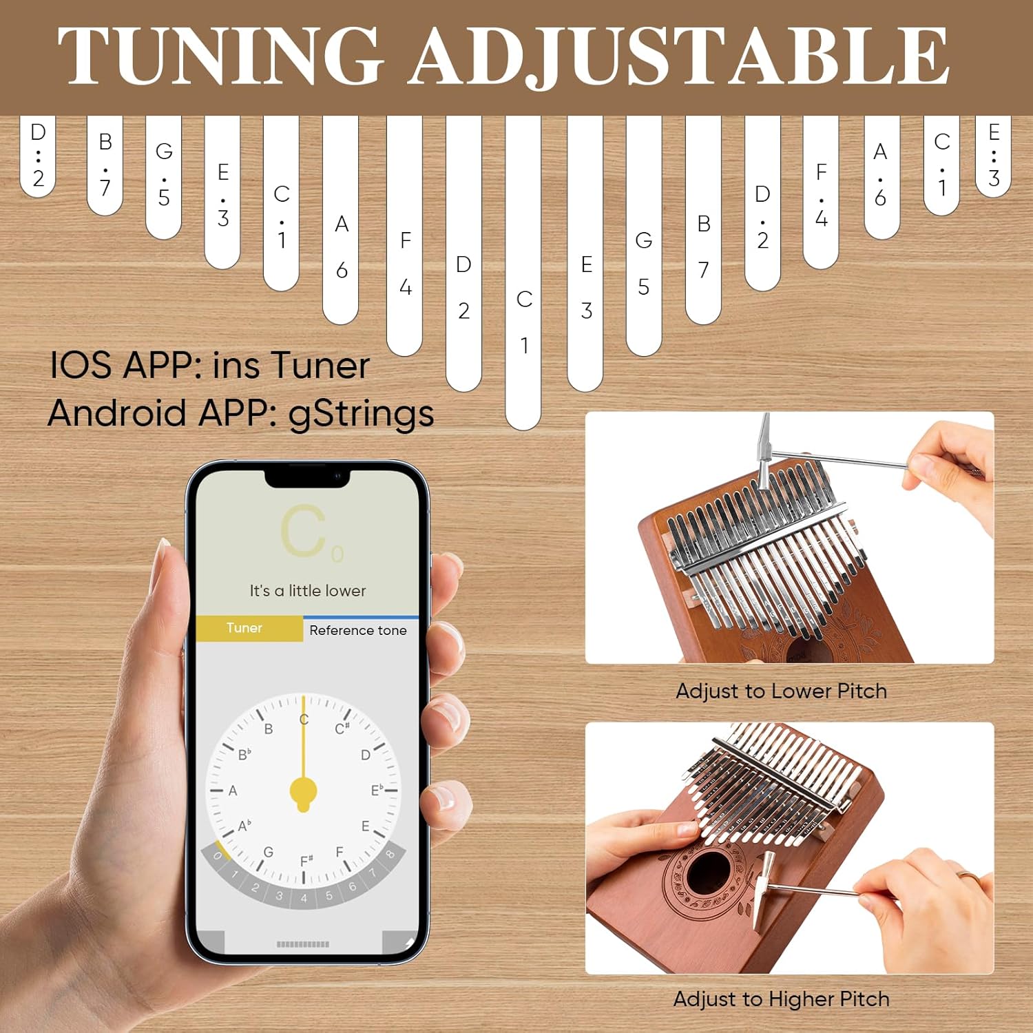 - Beautiful Soud: 17 key kalimba has a warm and rich tone like mahogany, with a sweet and pleasant sound. Finger piano kalimba body is made of solid wood and box structure, with strong resonance and a crisper, louder and longer sound. The kalimba 17 keys tuned in C are staggered for flexibility and wear resistance, and produce a pleasant resonant sound when played gently, ideal for acoustic playing