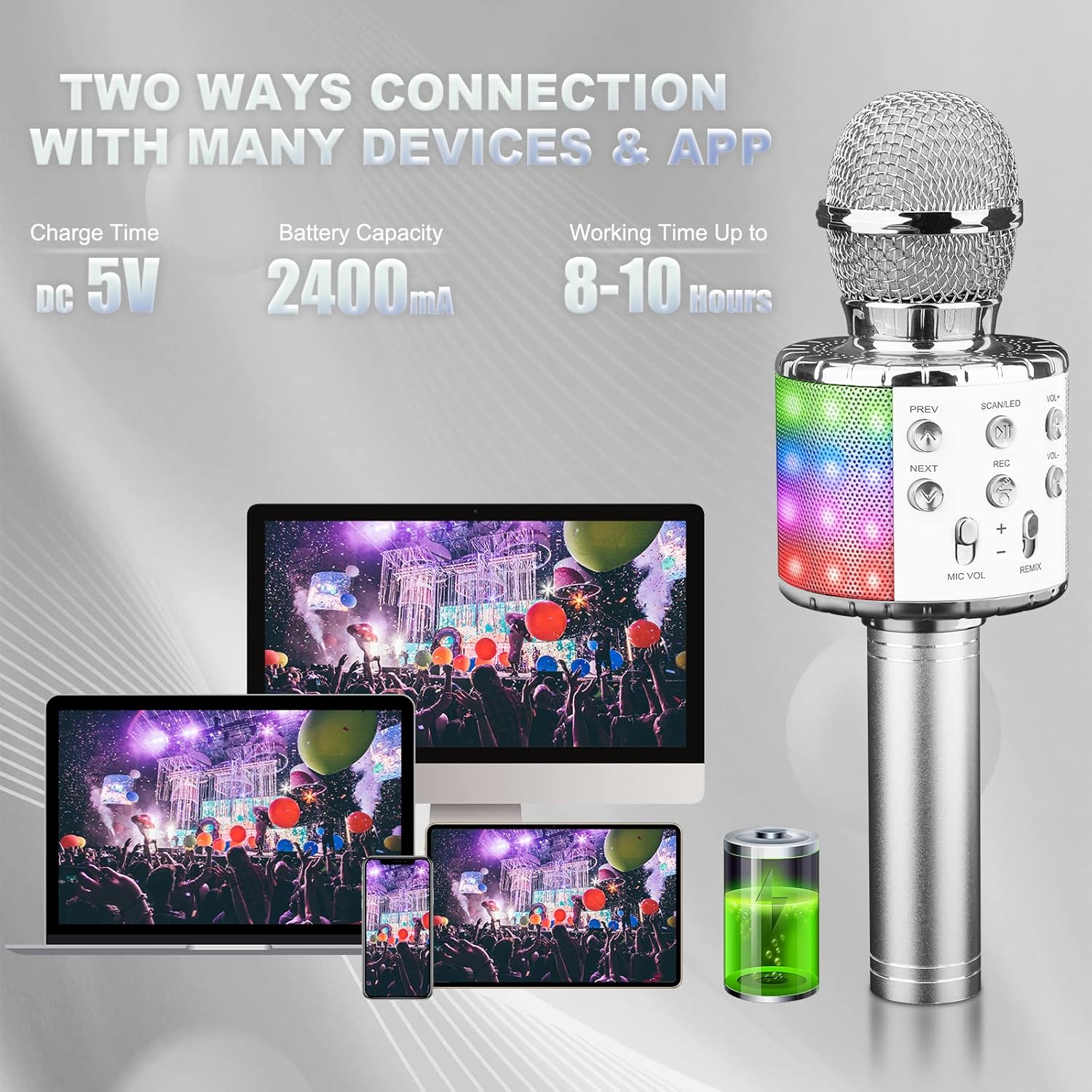 - âȘăLong Palying TimeăBuilt-in 2400mA rechargeable battery, this Wireless wireless Karaoke Microphone can last more than 5-6 hours after a fully charge.
