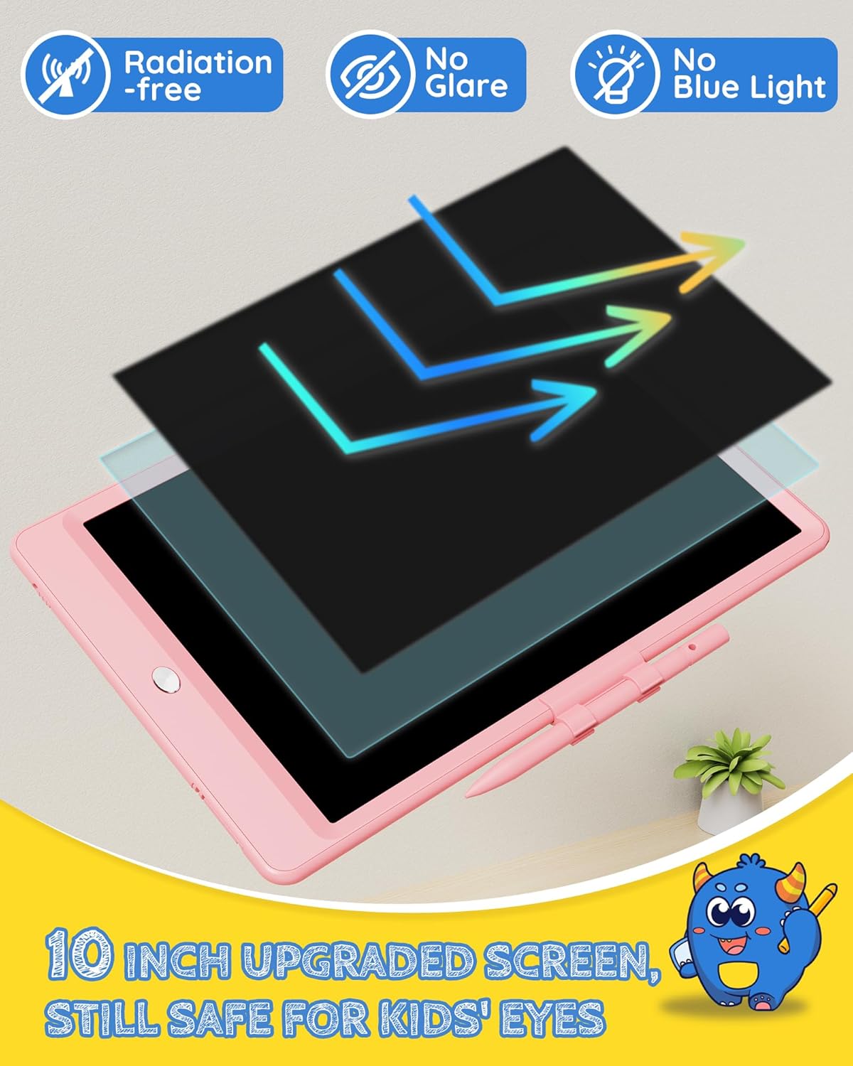 - Free Child’s Imagination: Tekfun LCD writing tablet for kids provides 10 inches of space for kid’s writing and drawing, free children's imagination. The eye-protection colorful screen of doodle board provides a better painting experience, avoiding injury to a child’s eyes from long-term use