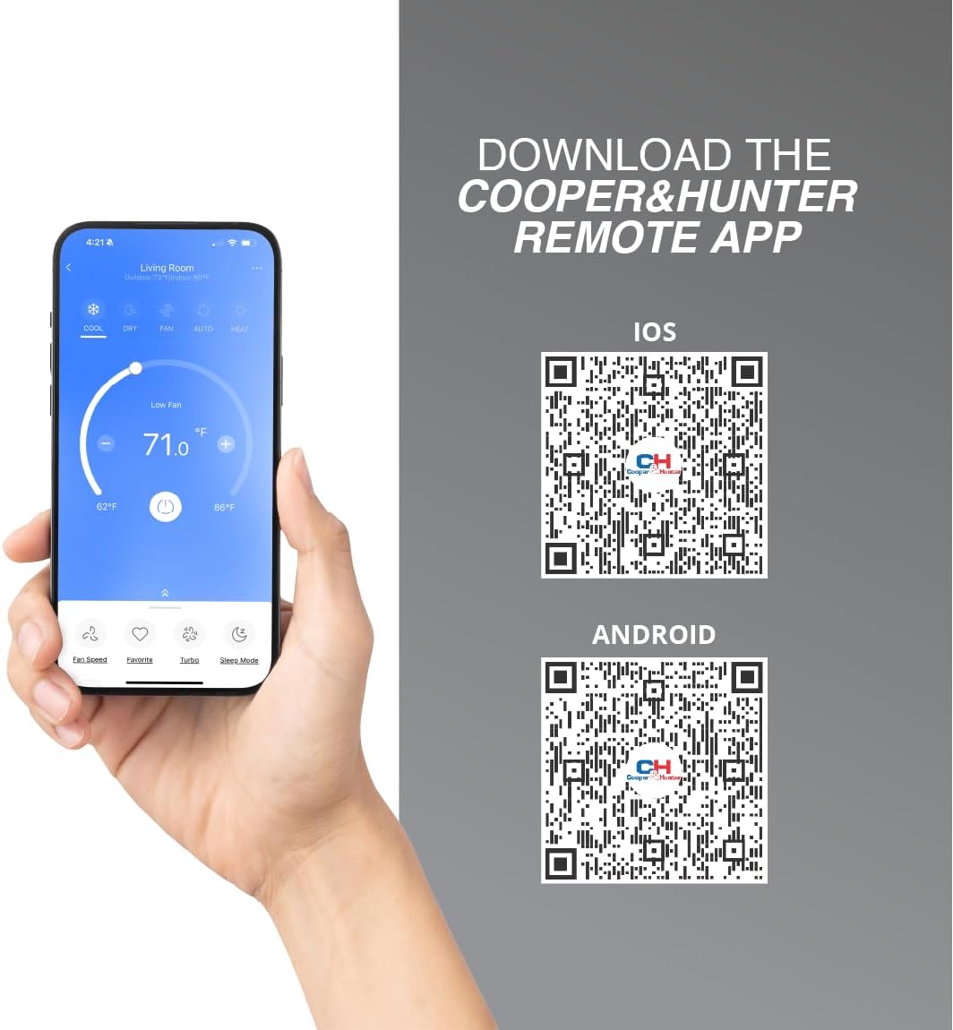 - Comes with a smart port adapter to easily turn your units ON and OFF, set the temperature, alternate between C° and F°, switch modes, and adjust the fan speed using your smartphone and a C&H Remote mobile app. Pre-charged with refrigerant. Works for heating with ambient temperature up to 5F°