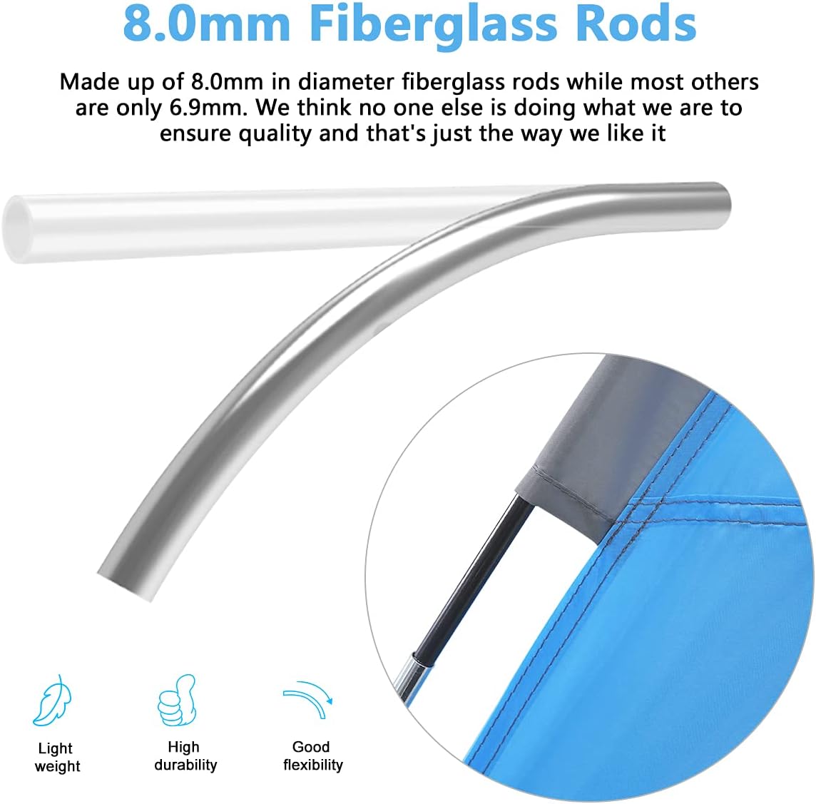 - Good Flexibility & Higher Durability - Fiberglass rods increased from 6.9 millimeter (market standard) to 8.0 millimeter for a more flexible and durable framework when installing in the shade. Dependable and reliable rods are essential, therefore we made this change in order to extend the rod’s lifespan, just to ensure our fiberglass rods can withstand multiple usage even after a long period of time.