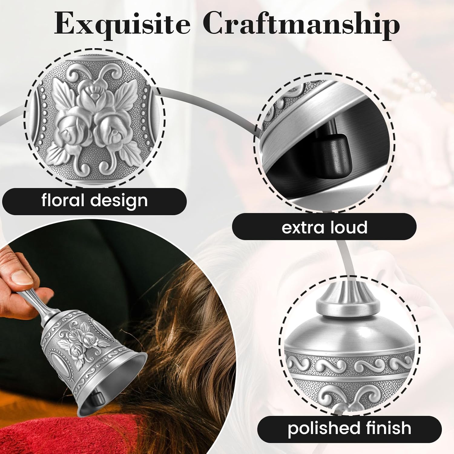 - PACKAGE INCLUDED - 1 x Ornate Antique Silver Hand Bell measures 2.2 x 2.2 x 4.6, applied with electroplating process and polished finish, extra loud, multi-purpose, easy to clean and care.