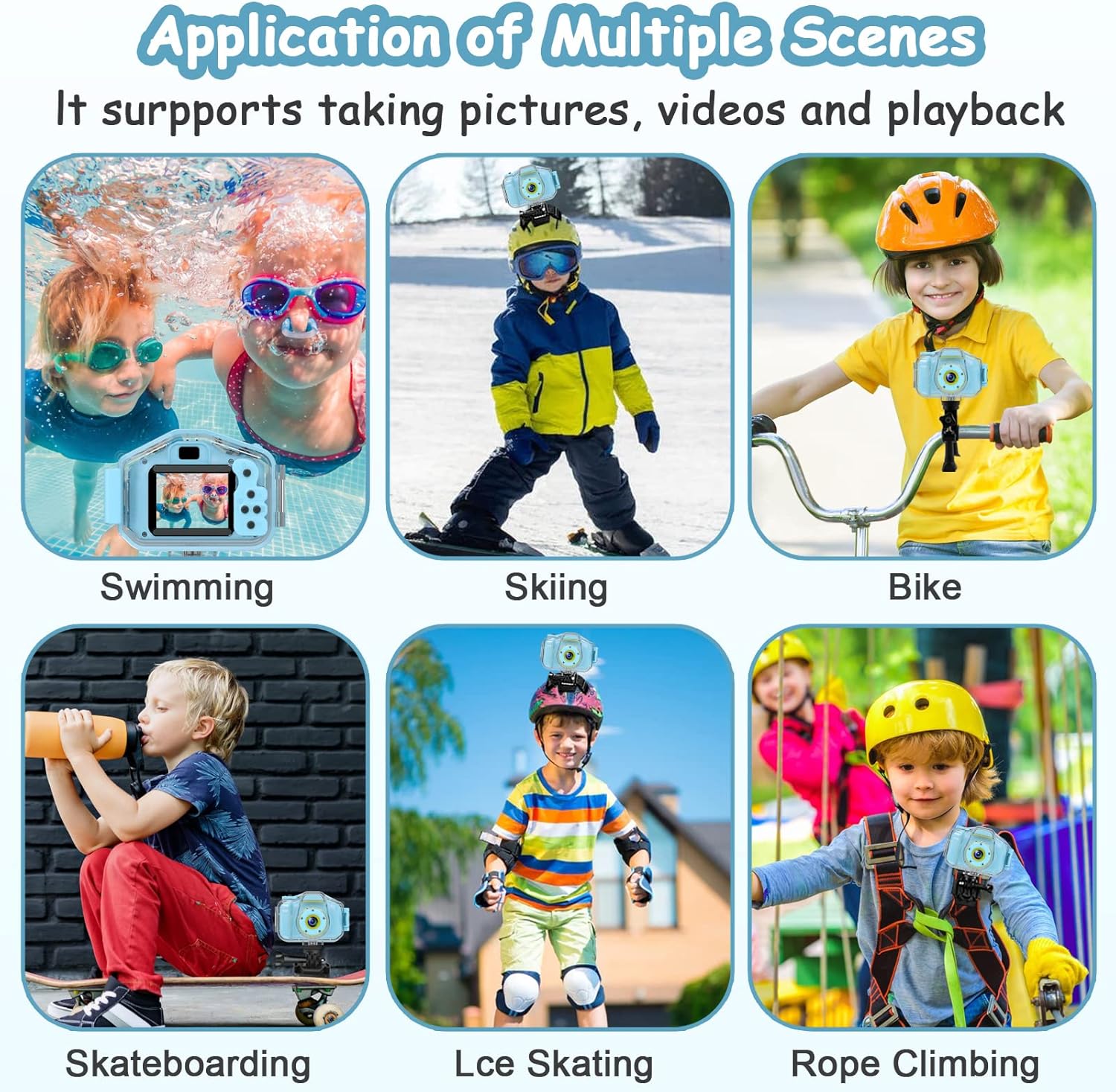 - Other Accessories and After Service: Versatile mounting kits which allows the kids camera to be attached to any flat surface (skateboards, helmets) and bikes. Package included a durable lanyard for children to hang the camera on neck, carry everywhere. After Service, any problem about our kids camera feel free contact