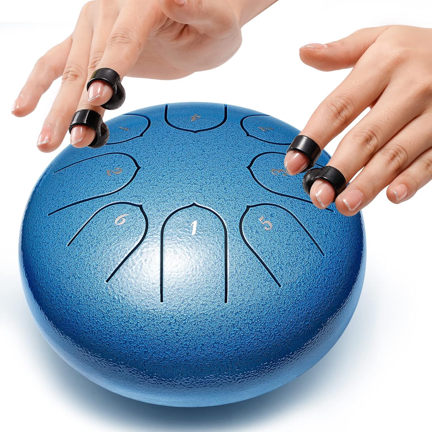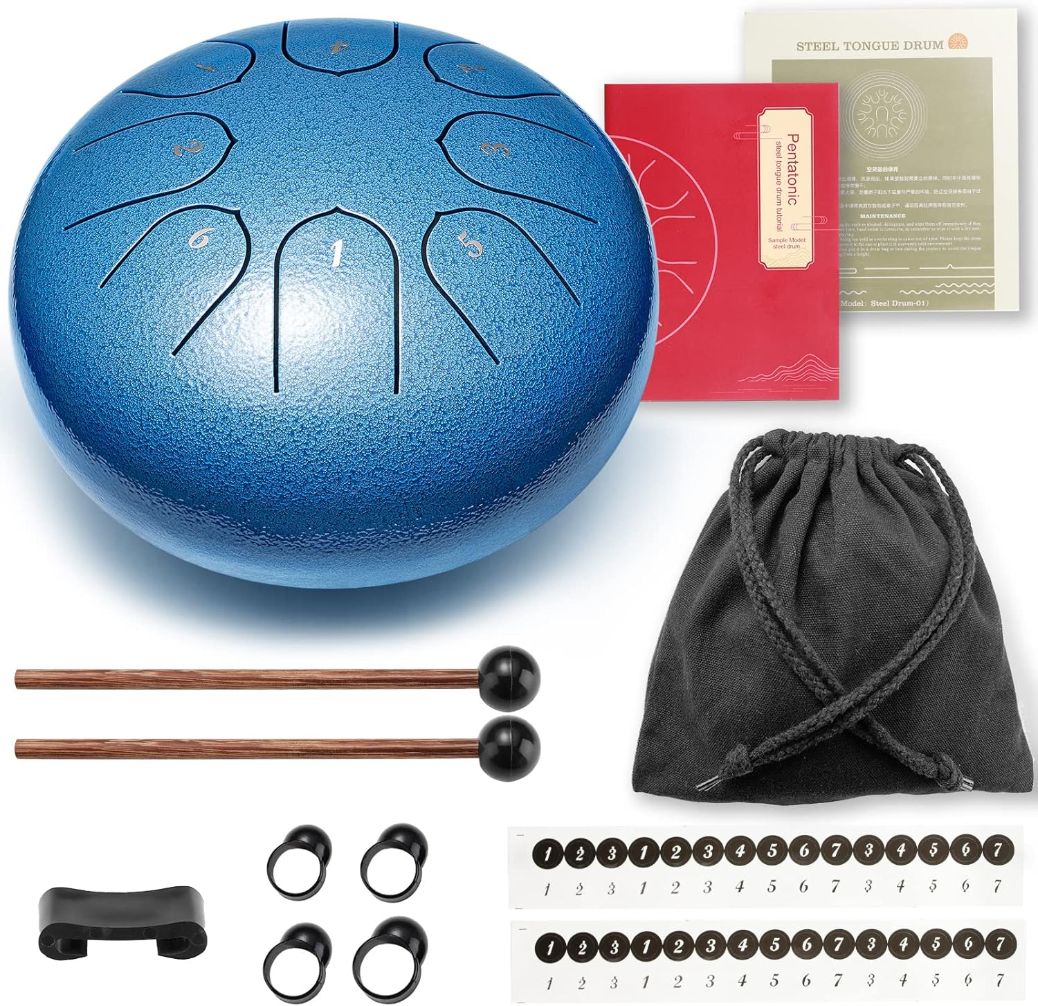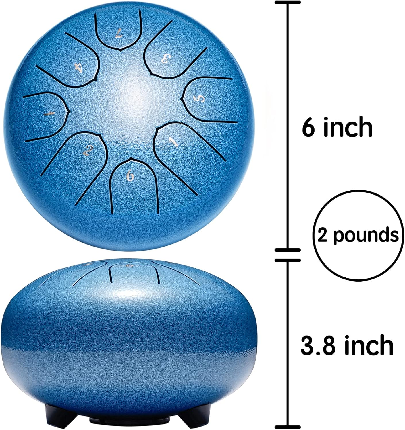- π Accessories Upgrade: 6 inch steel drum, drum mallets, drum bag, finger plectrums, spare note stickers, sheet music, mallets stand. Steel drum are a total of 8 tones, which have a wider range of sound and can play more music. You can play steel drum with the included drum mallets or with you hands, and the included note enable beginners to learn and play it more easily. Steel drum comes with a carry-on bag for easy carryinag