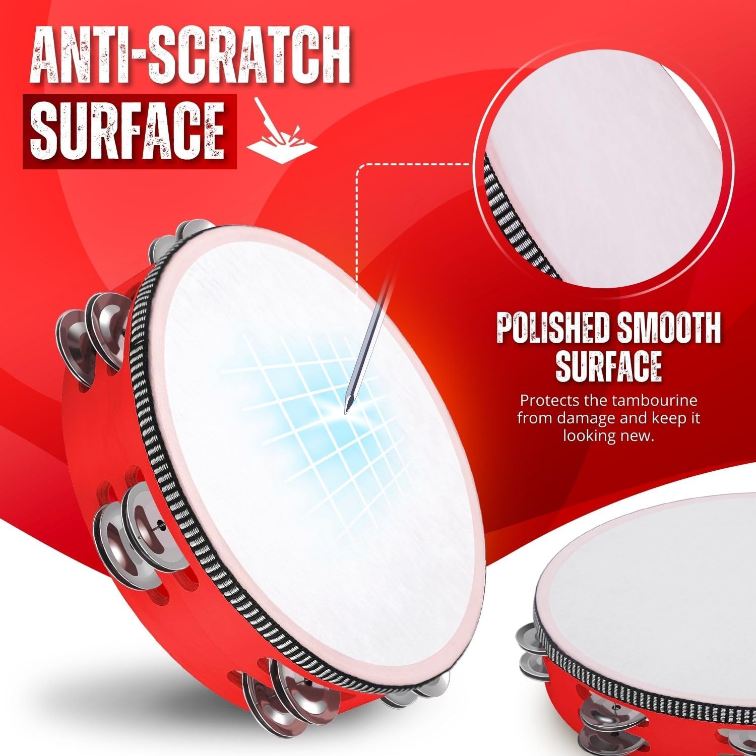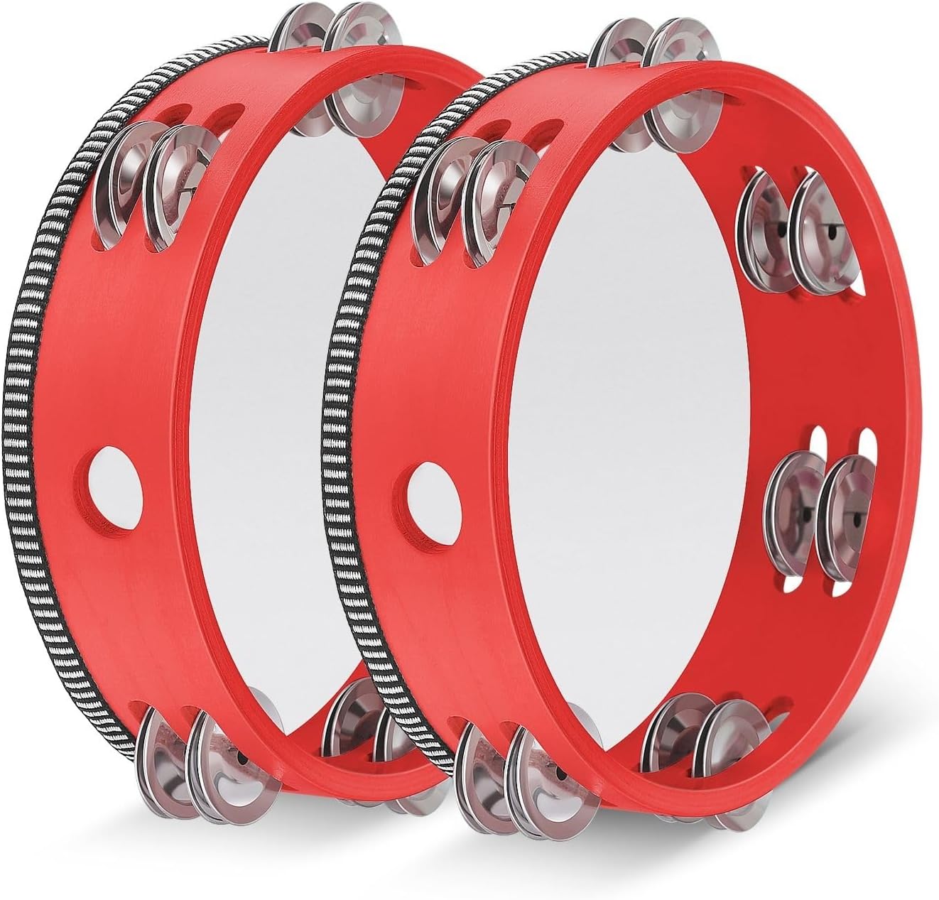 Flexzion Wood Handheld Tambourine (2 Pack) 8 Inch Double Row 12 Pair Jingles, Hand Held Percussion Drum Moon Musical Instrument with Metal Bell