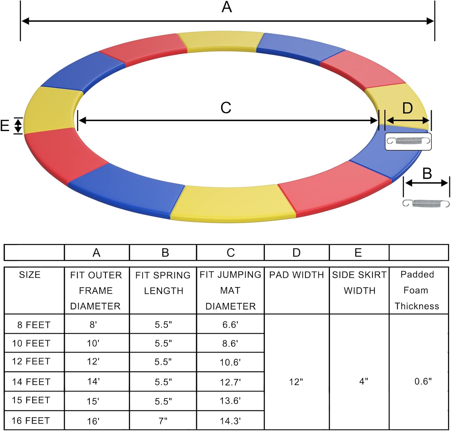 - [ Easy to Assemble & Replace ] Our 12 Ft trampoline safety pad has a folding design, which helps to reduce a lot of tedious assembly steps. All you need to do is lay it flat on the trampoline and fix the 36 elastic ropes. The simple replacement process will not waste your too much time and energy.
