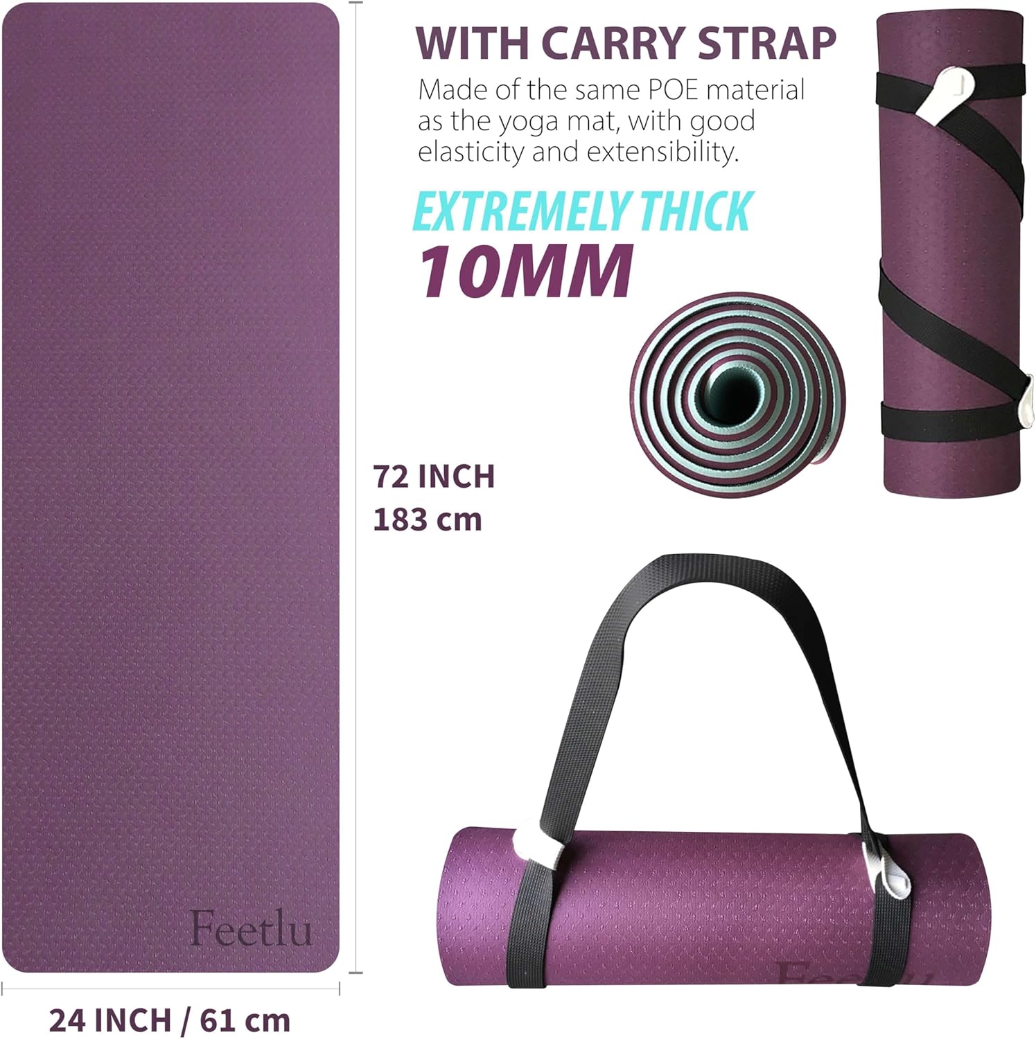 Extra Thick Exercise Yoga Mat with Strap - 2/5 Inch (10MM), Non-Slip Workout Mat for Yoga, Pilates, and Floor Exercises