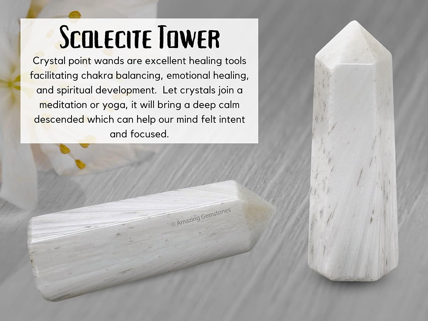 - Scolecite Crystal Tower will uplift and purify the energy (if its point is not damaged), so you can place it in any area that needs to be re-energized with strong energy. Length of this tower / wand / obelisk / point is 2" inch to 3" inch (5cm to 7.5cm) & width is 0.75 inch (2 cm).