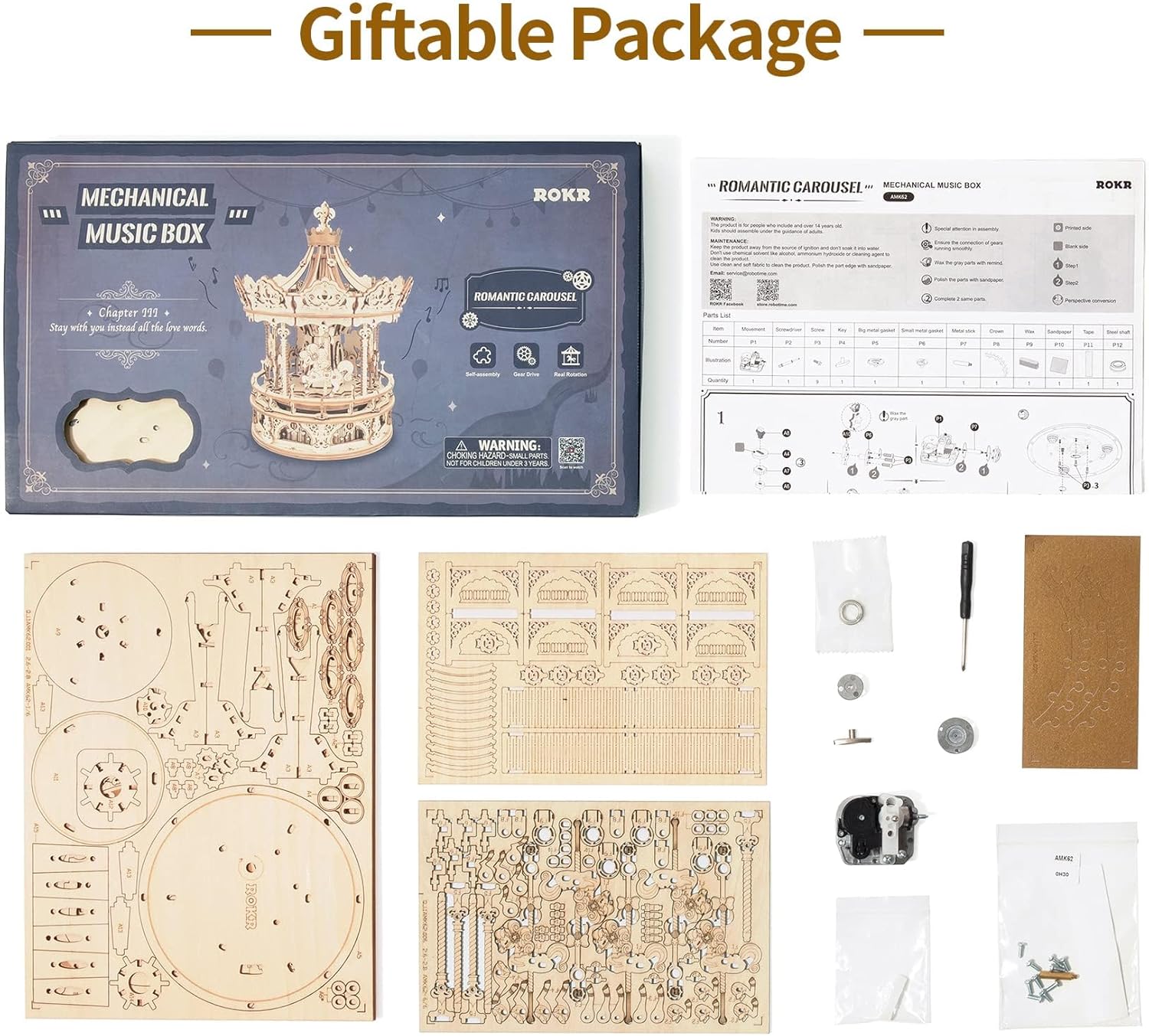 ROKR 3D Wooden Puzzles Music Box - DIY Model Building Kit Mechanical Merry-go-Round Exquisite Display Gifts for Teens Man/Woman Family