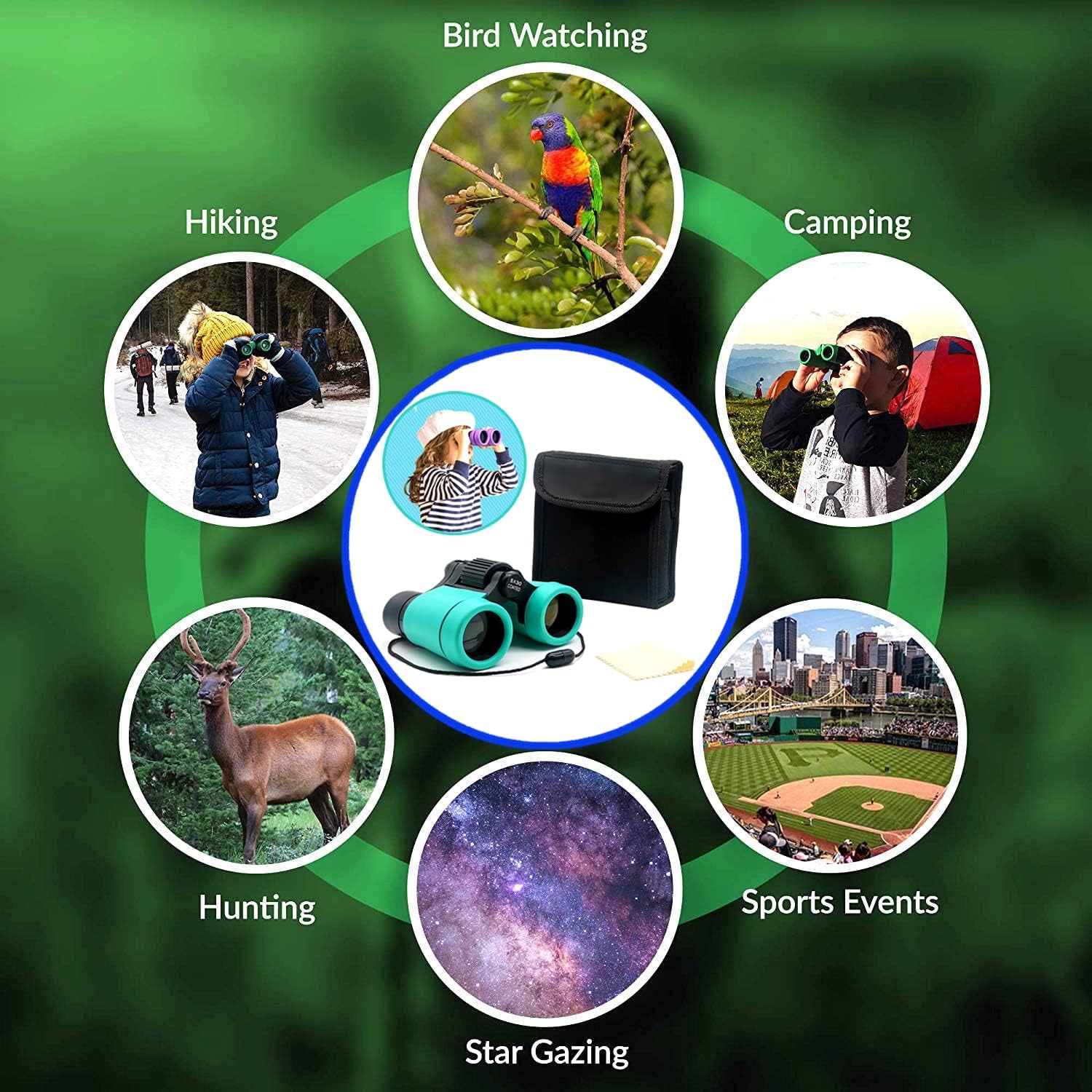 • Best Gift for Kds : Designed for kids binoculars,soft-rubber eyepiece protect the eys, so kids won't hurt their eyes.The compact kids binoculars can be folded to match eye to eye Distance Of Child.Great for bird watching, learning, hunting, theater, boat rides, hiking, traveling, and enjoying the wilderness! Explore the world with your kids!Perfect For The Children's Toy Or Educational Gifts