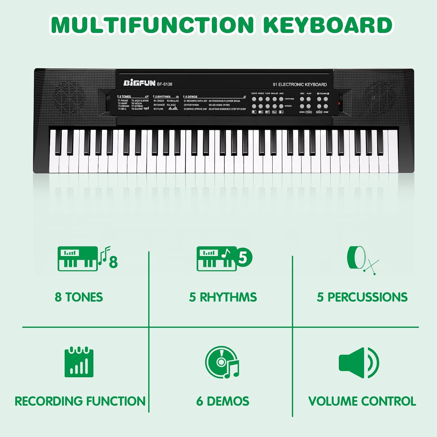 M SANMERSEN Kids Music Keyboard, 61-Key Portable Electronic Piano Toy with Microphone, Teaching Tool for Beginners, Ages 3-12, Black
