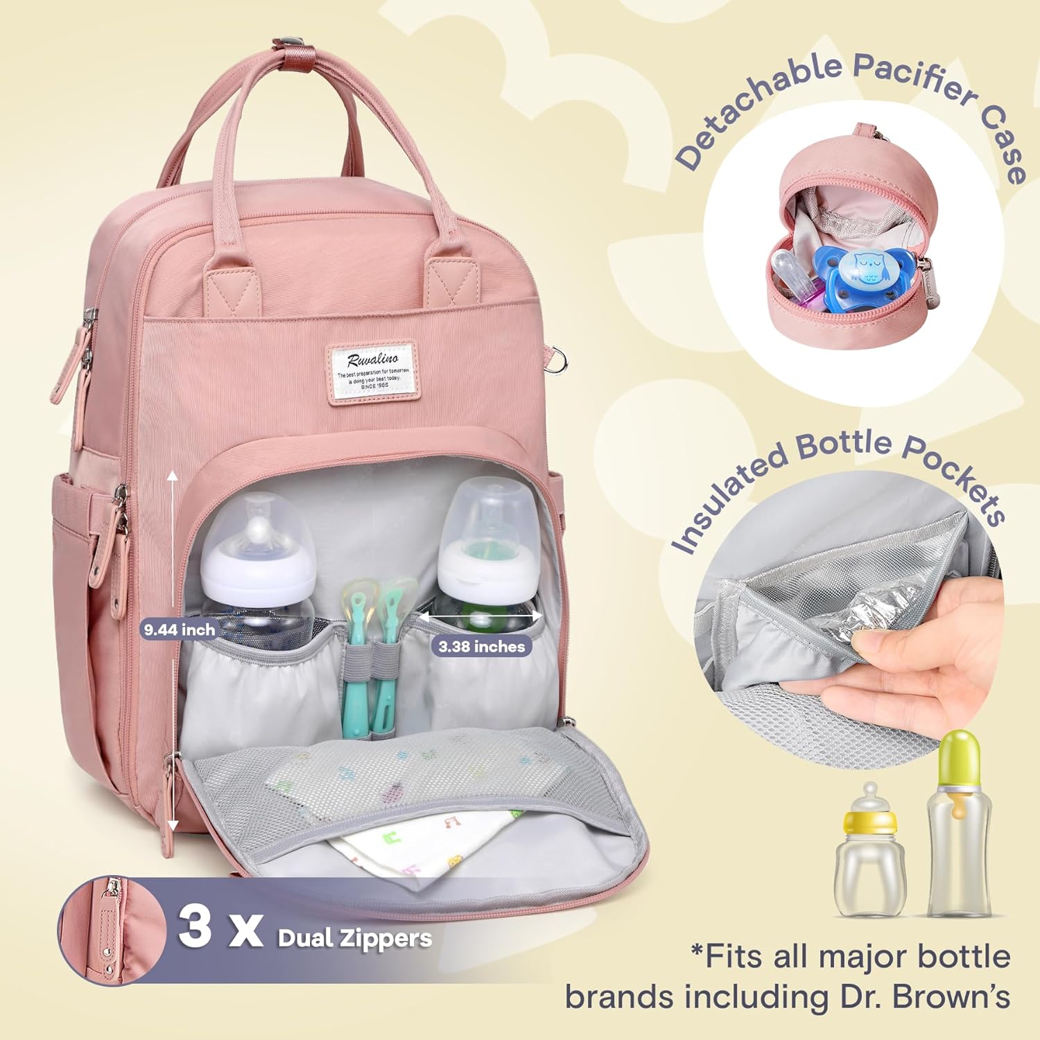 RUVALINO Diaper Bag Backpack, Multifunction Travel Back Pack for Girls, Maternity Baby Changing Bags with Changing Pad for Mom, Large Capacity, Waterproof and Stylish, Pink