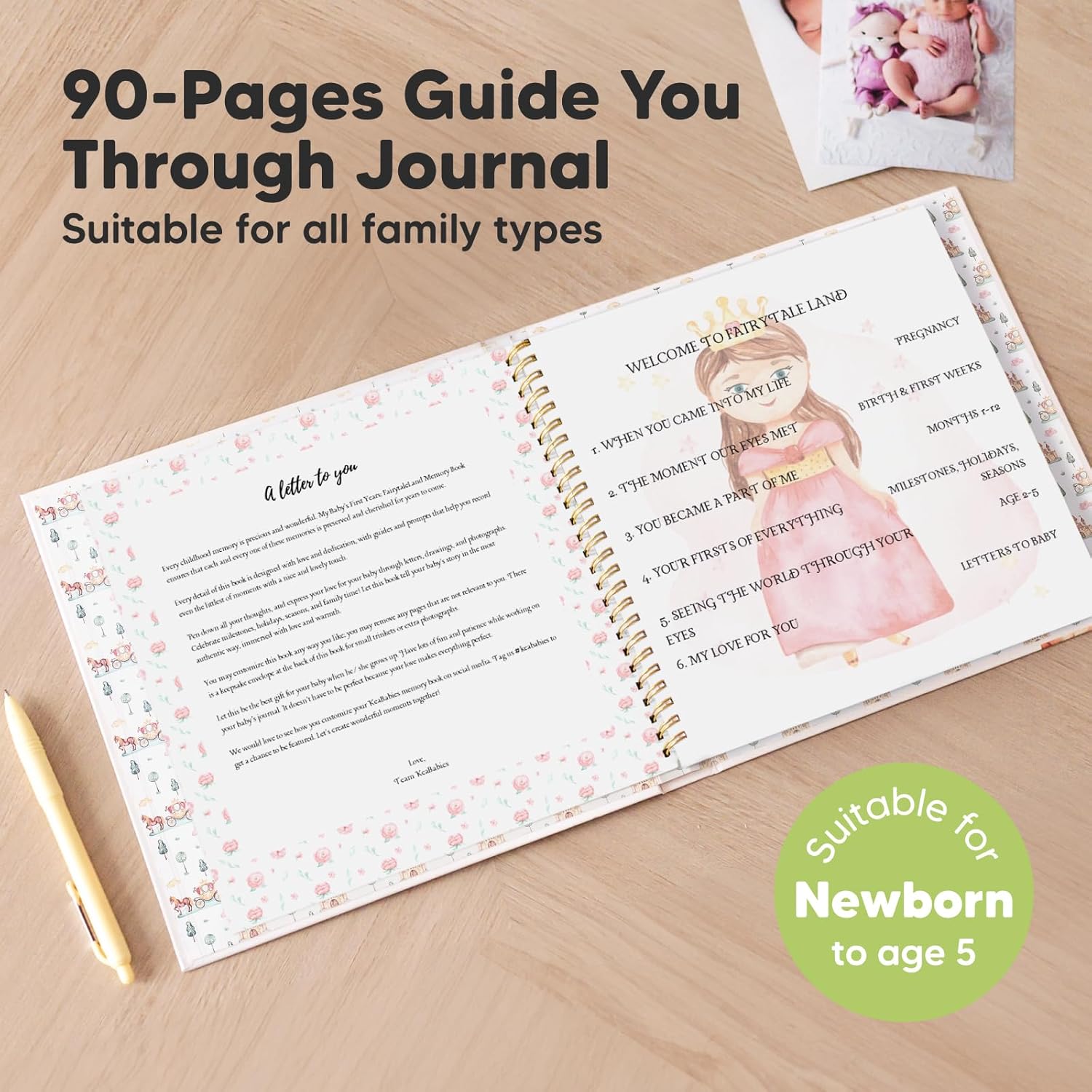- 90 Guide You Through Pages - Our baby memory book first 5 years offers simple prompts to record your baby's milestones and precious moments throughout their early years. Youβll find it easy to complete your first year baby book journal.