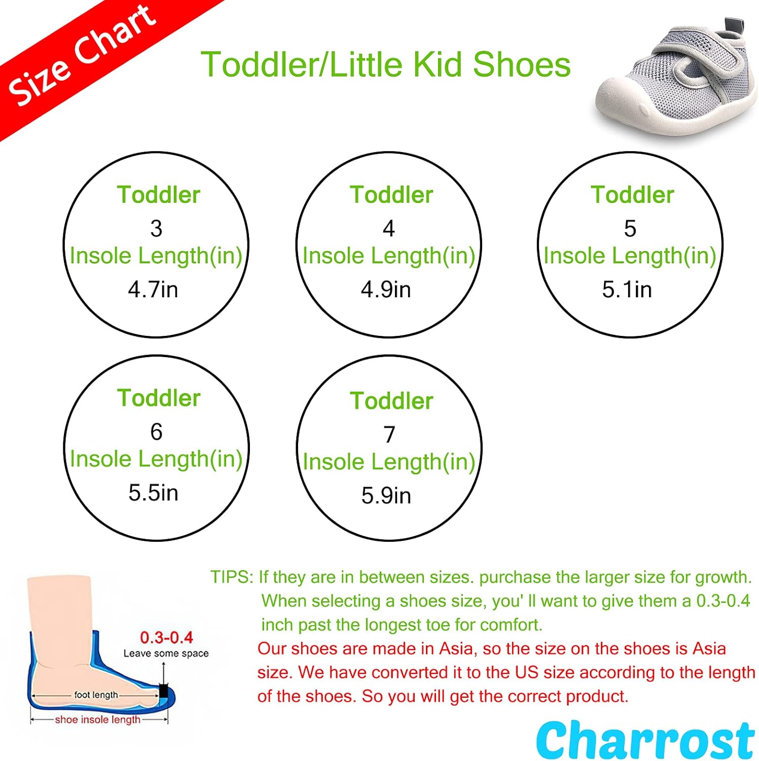 • Size,Suitable for 1-3 year-old children. US 3 Toddler: Insole length: 4.7 in(Tag size:14); US 4 Toddler: Insole length: 4.9 in(Tag size:15); US 5 Toddler: Insole length: 5.1 in(Tag size:16); US 6 Toddler: Insole length: 5.5 in(Tag size:18); US 7 Toddler: Insole length: 5.9 in(Tag size:20)