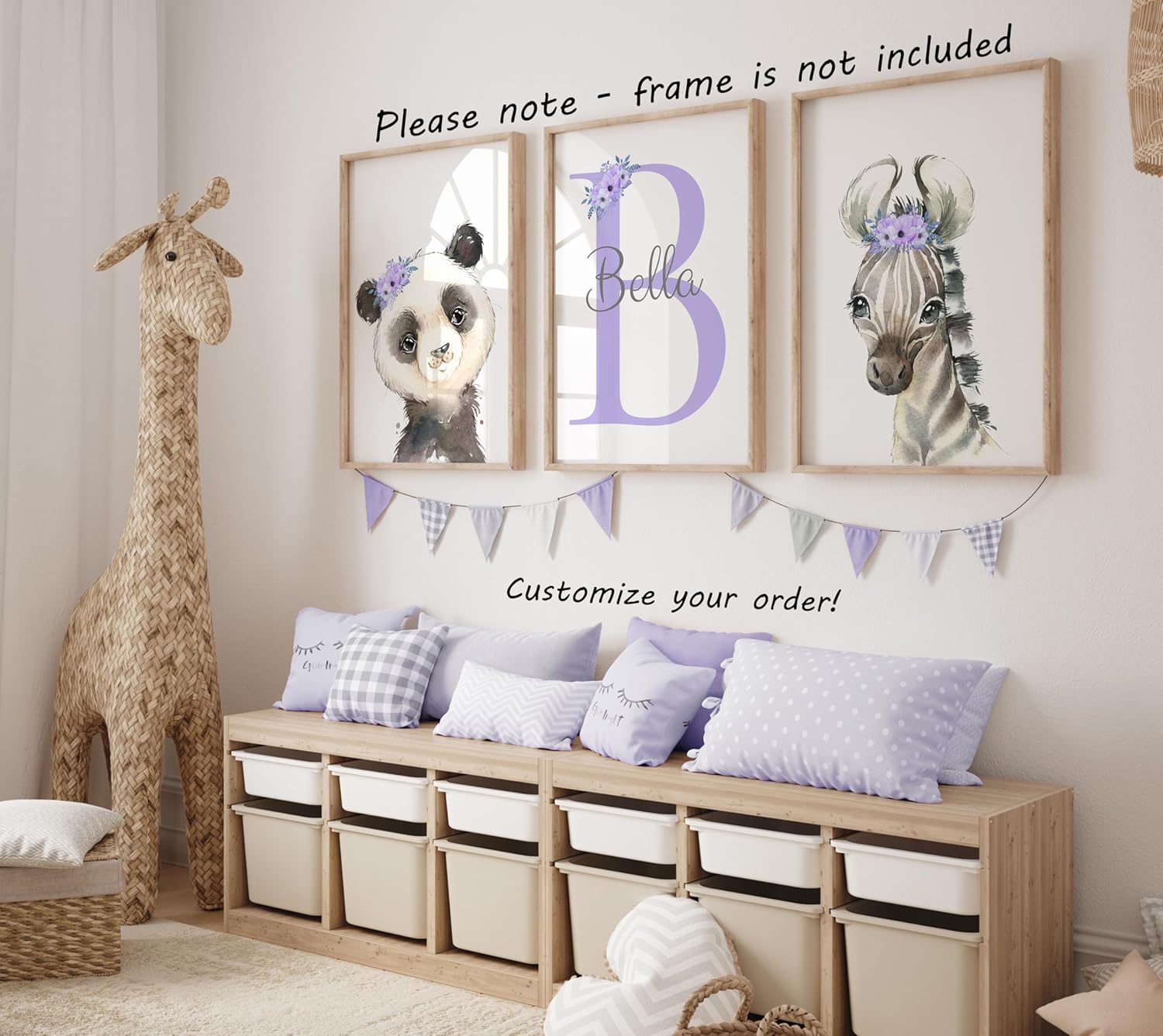 Personalized Safari Animals for Baby Girls Nursery, Set of 3 Unframed Poster Prints, Personalized Name Pink Lilac Floral, Girls Bedroom Decor, Elephant Giraffe (17x22)